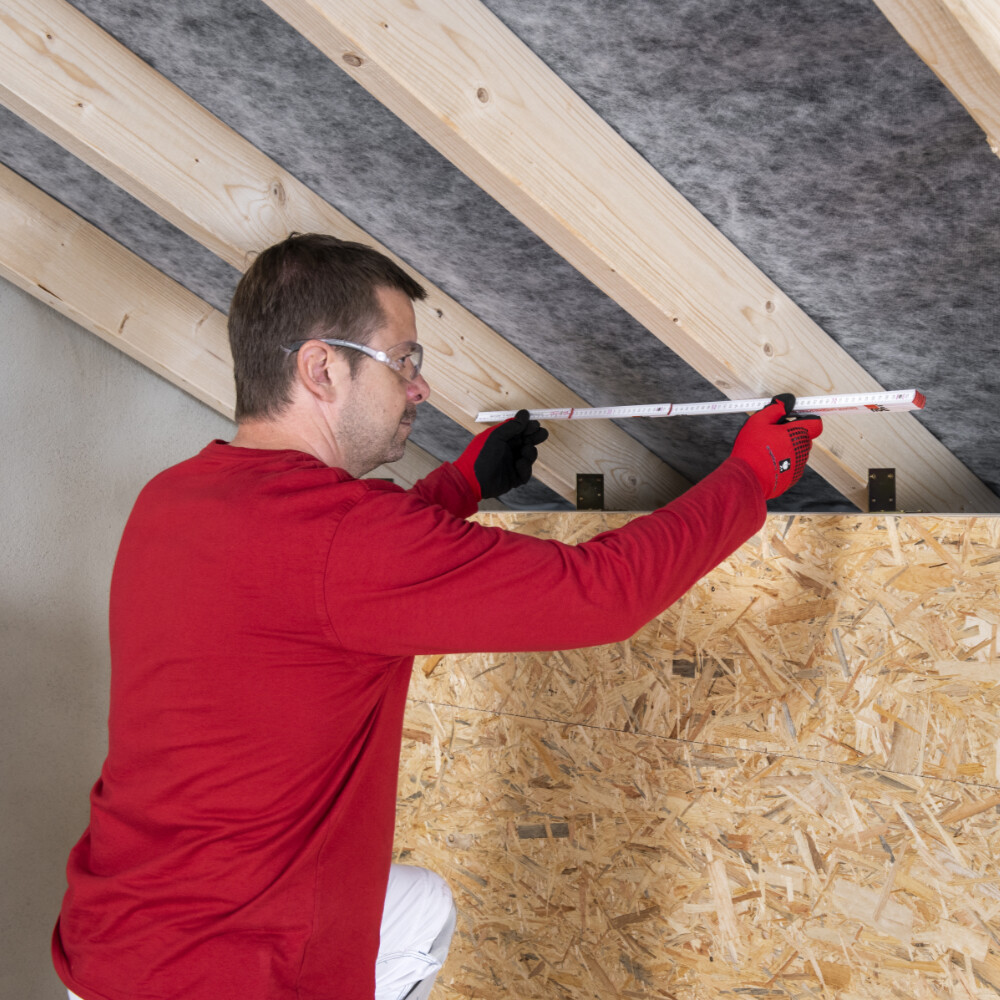 Si, comme sur notre photo, un mètre tient sans problème entre le feutre de serrage et les chevrons, tu as choisi la bonne largeur de découpe.