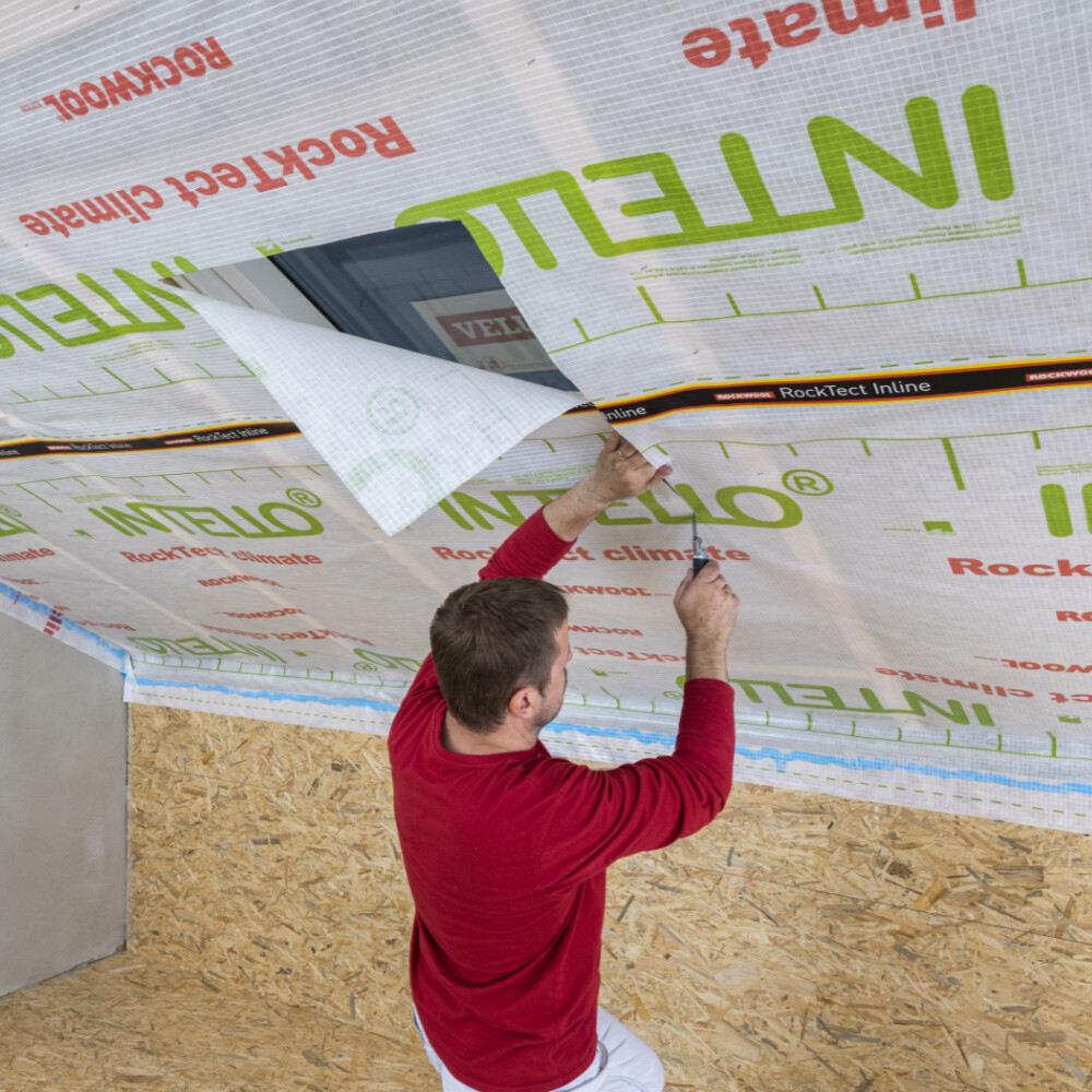 Comme la profondeur d'installation peut être variée, le tablier pare-vapeur est livré avec un film pare-vapeur suffisamment long. Un chevauchement sur la face intérieure du pare-vapeur d'environ 10 à 15 cm est toutefois suffisant.
