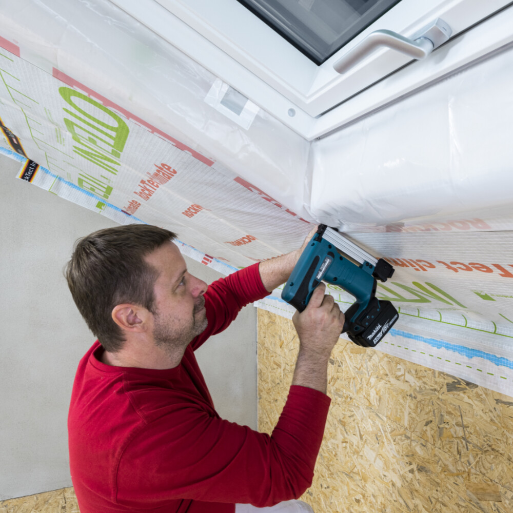 Une fois les travaux terminés, la jupe pare-vapeur est collée sur tout le pourtour, sans espace et de manière étanche à l'air avec la bande adhésive sur le pare-vapeur.