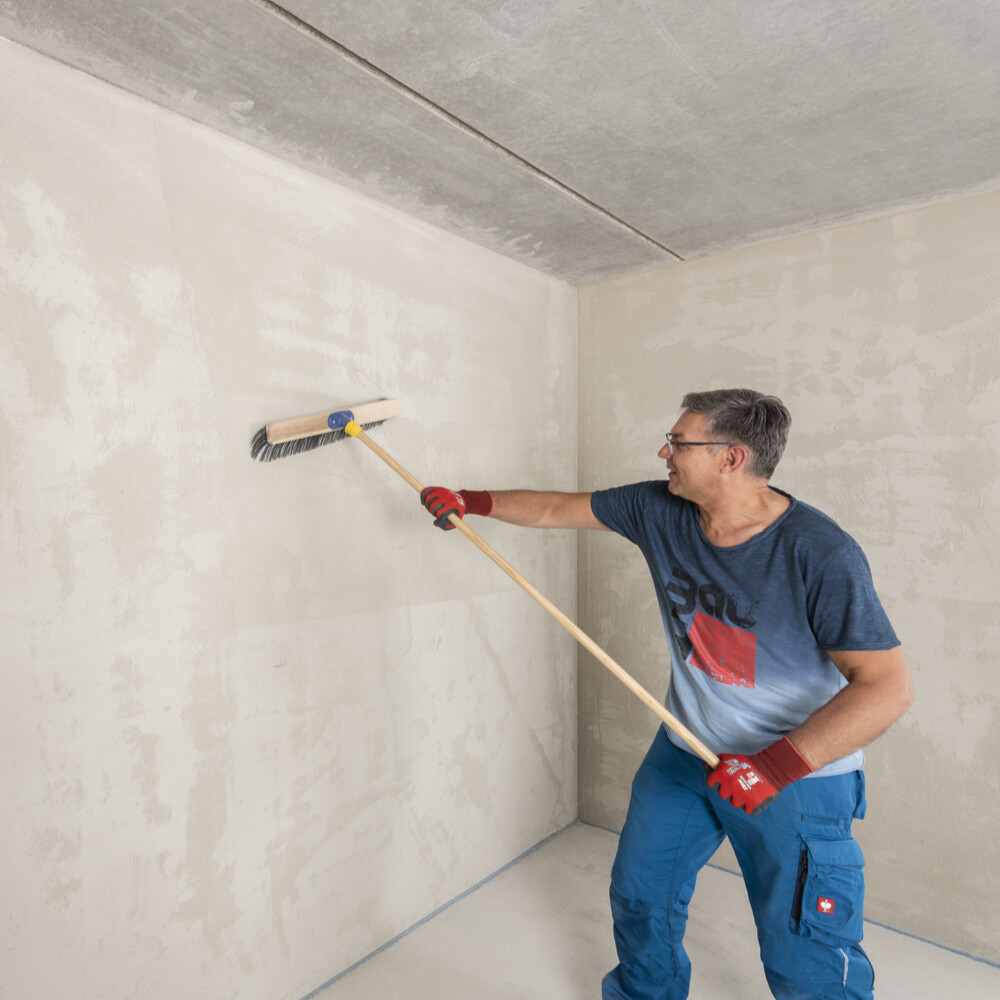 Après que l'enduit a déjà légèrement pris, la surface est brossée avec précaution. La couche de frittage est ainsi détruite et la meilleure base est créée pour que la prochaine couche d'enduit puisse s'accrocher de manière idéale au support.