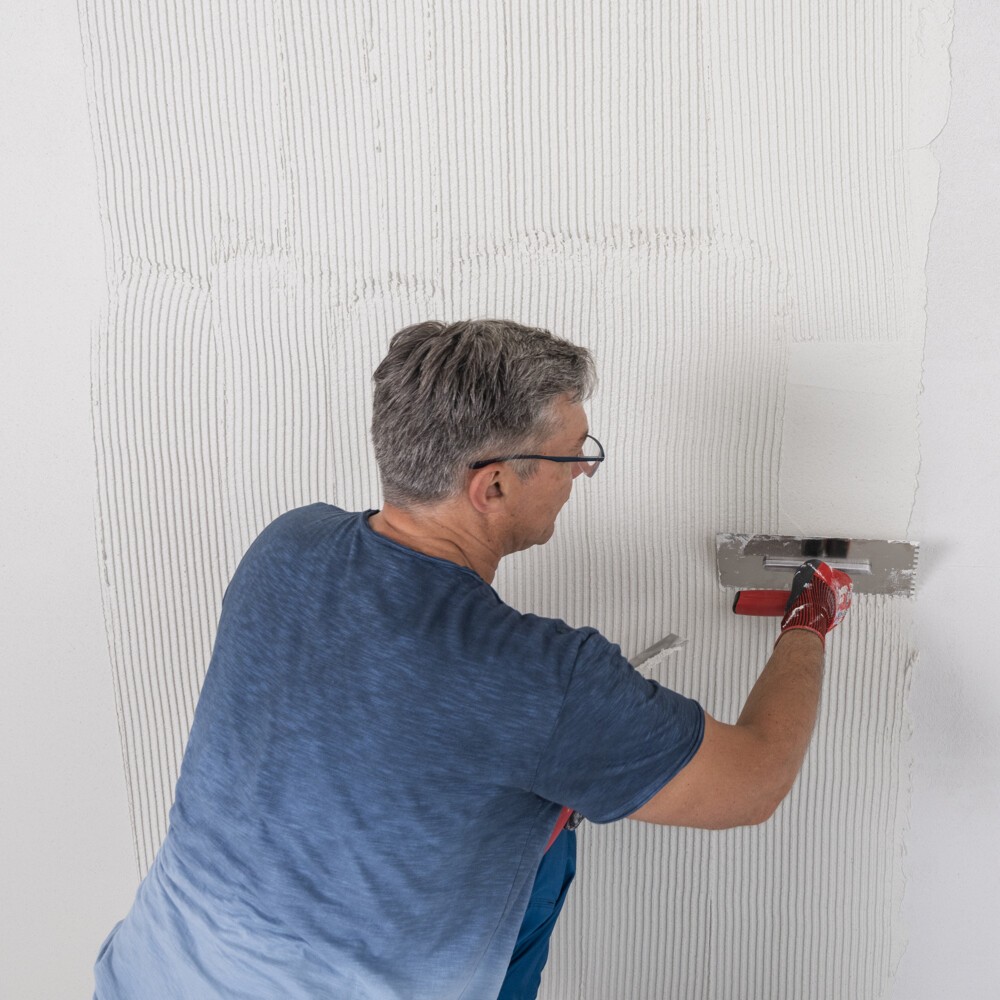 Pour te faciliter l'application d'une épaisseur d'enduit fine et régulière, nous te conseillons de peigner l'enduit fraîchement appliqué avec une truelle dentée. Les nervures doivent être bien serrées, les nervures creuses et hachées en forme de point indiquent un manque de Matériau.
