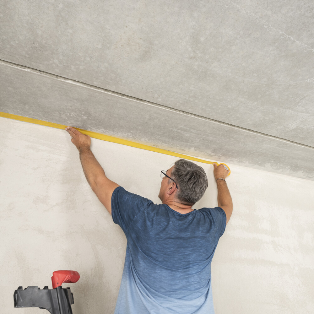 Protéger les surfaces adjacentes, telles que les murs ou les plafonds, contre les salissures à l'aide d'un large ruban de masquage ou d'un ruban de masquage avec film.