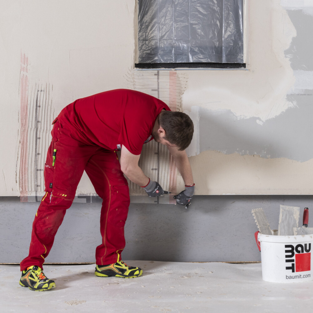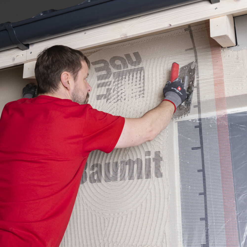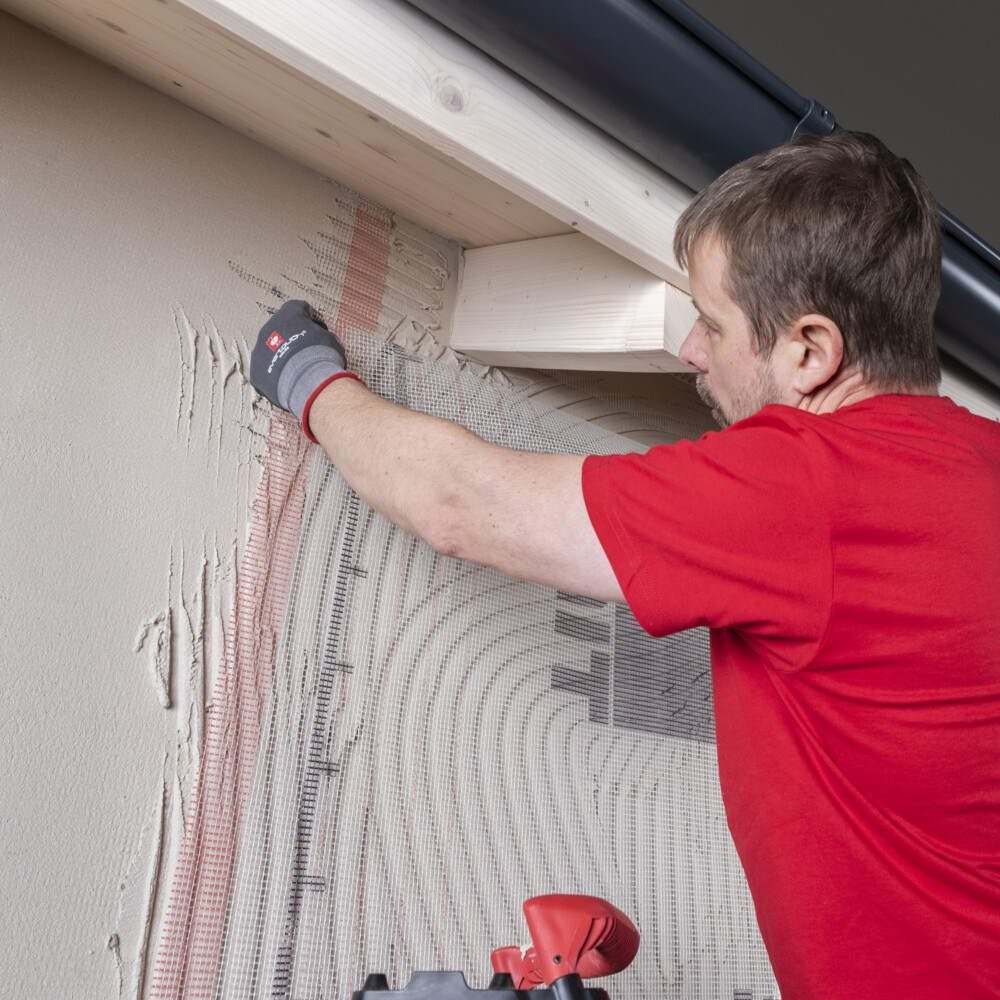 Juste après, tu poses la Toile d'armature Baumit dans la couche fraîche d'enduit d'armature.