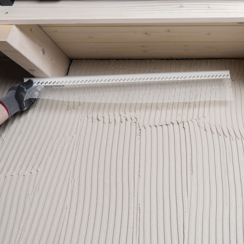 Avant d'appliquer la couche d'enduit d'armature sur toute la surface, le tissu du profilé emboîtable doit d'abord être encastré. Pour ce faire, applique l'Enduit pour façades et rénovation blanc fraîchement mélangé sous le tissu sur la plaque Fermacell Powerpanel H2Oà l'aide d'une truelle inoxydable.
