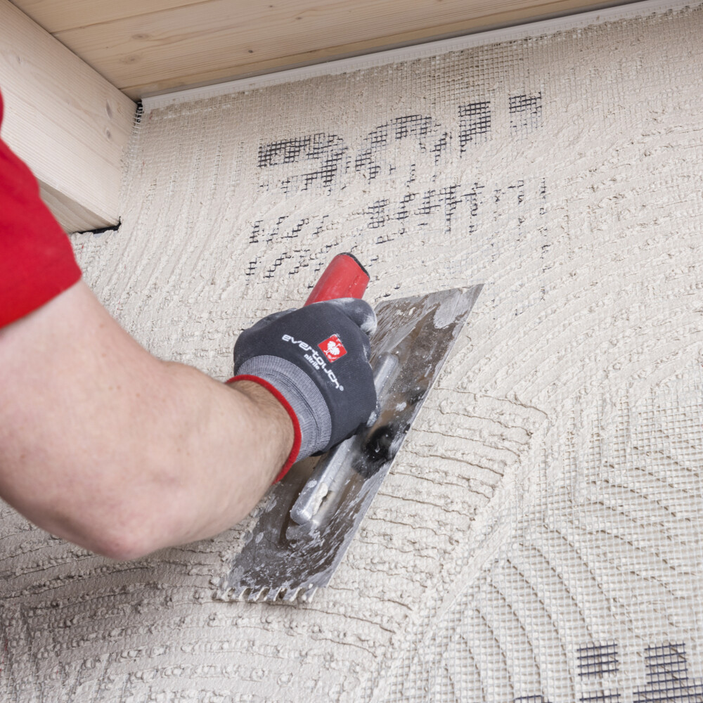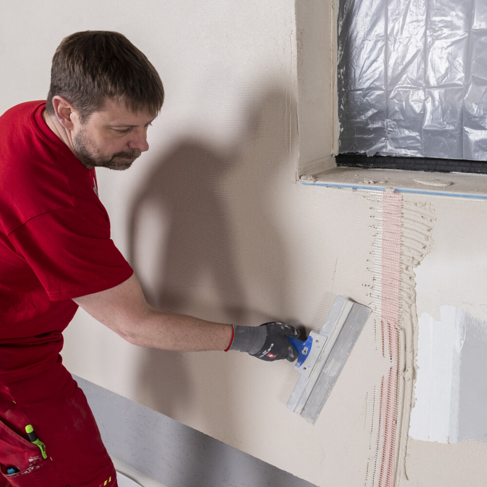 Pour les bricoleurs et les amateurs, le peignage des dimensions de l'enduit avec une truelle dentée facilite le respect de l'épaisseur d'enduit prescrite. Dans notre cas, tu utilises une truelle dentée de 10 mm pour obtenir une épaisseur d'enduit d'armature de 4-5 mm après le lissage.