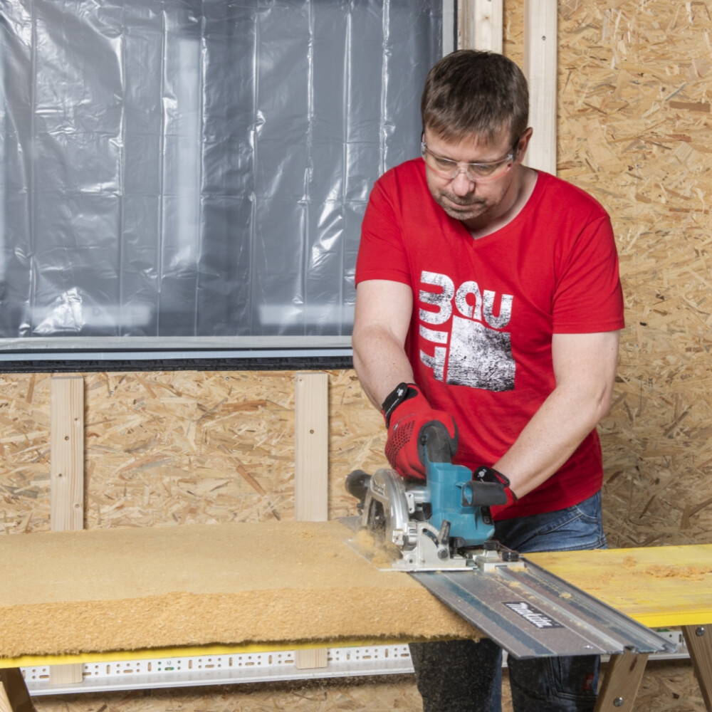 Tu peux obtenir des bords propres en utilisant une scie circulaire à main. C'est une solution pratique pour les isolants d'une épaisseur maximale de 100 mm. Respecte la profondeur de coupe maximale de la scie circulaire à main que tu utilises.