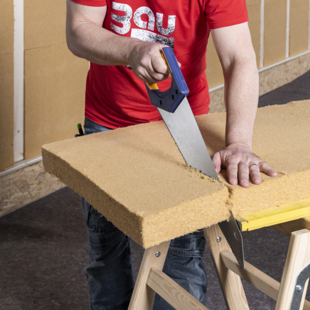 Si tu veux découper ce matelas isolant en fibres de bois avec une scie à main, place l'arête de coupe le plus près possible d'un bord dur. En raison de la structure des fibres, l'arête de coupe du Panneau isolant avec cet outil est légèrement effilochée.