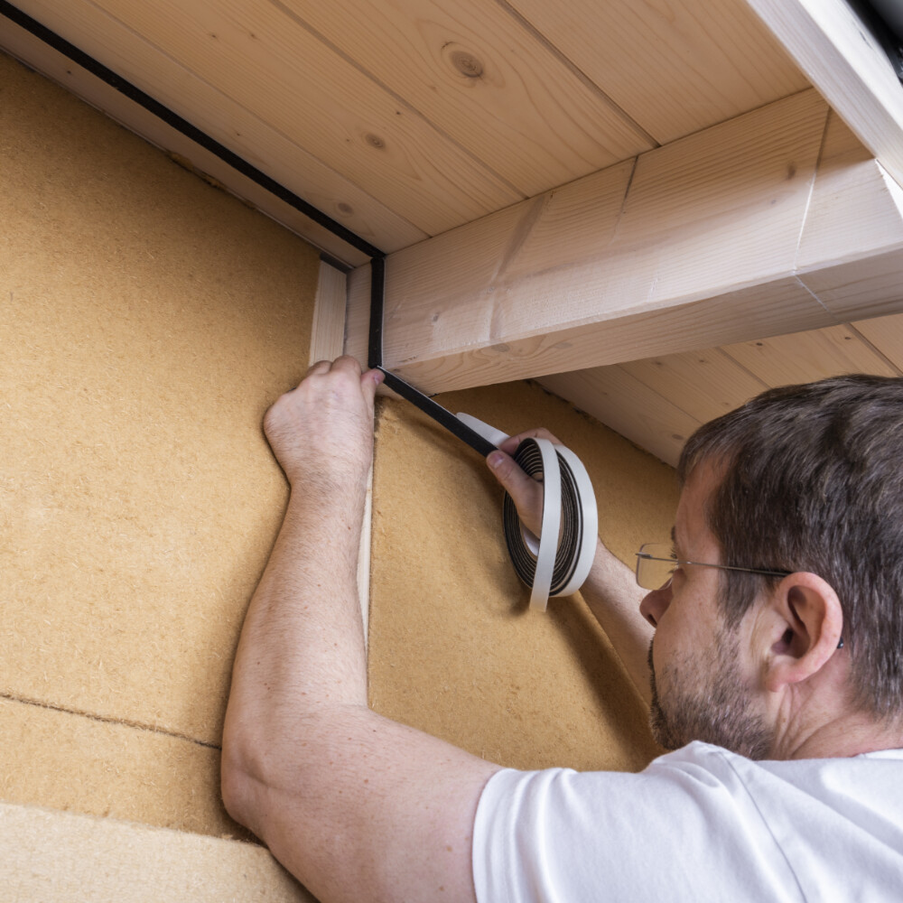 Juste avant le montage du Panneau isolant préparé, colle la Bande d'étanchéité de joint Baumit sur le raccord de toiture et les chevrons.