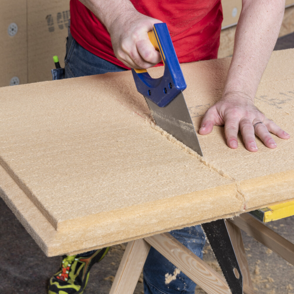 Tu peux couper le panneau isolant en bois à la longueur voulue à l'aide d'une scie à main courante.