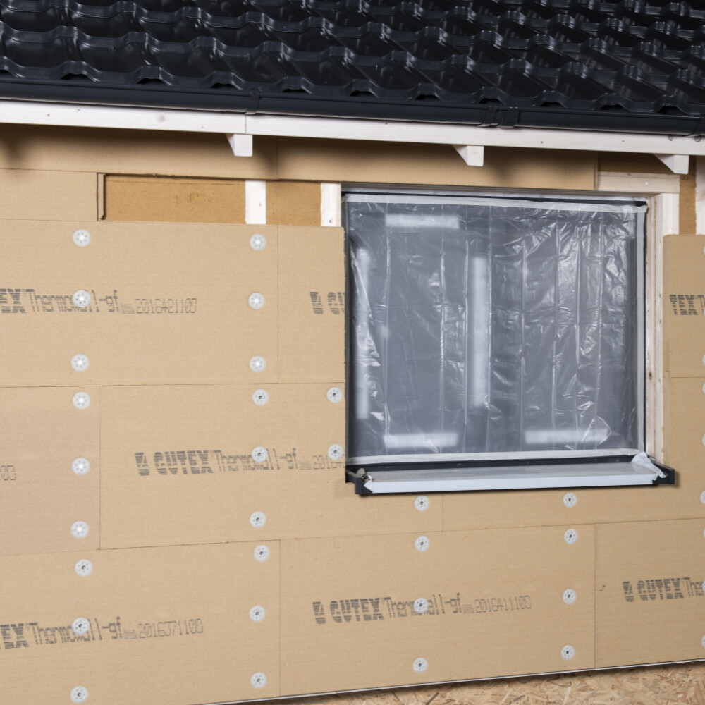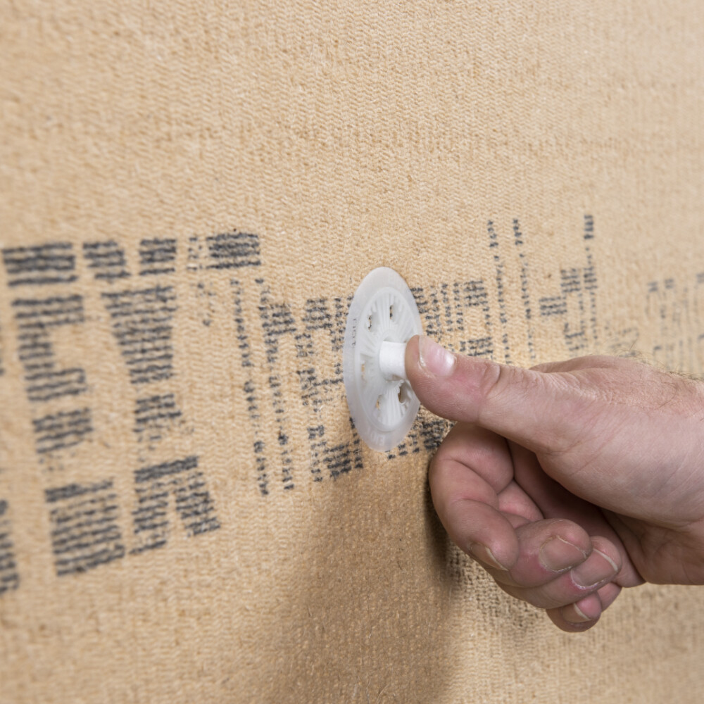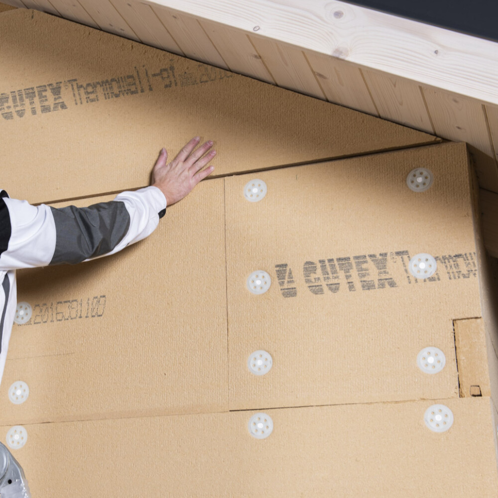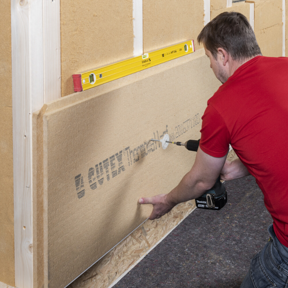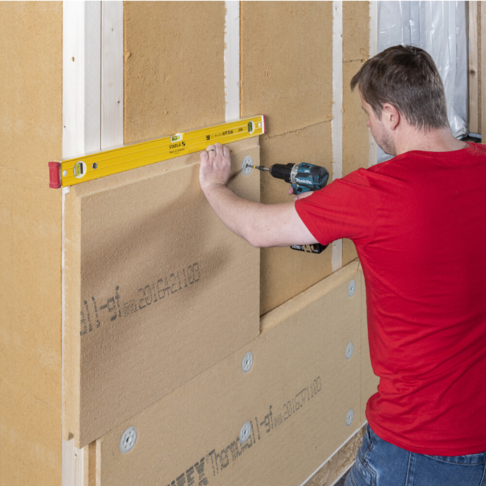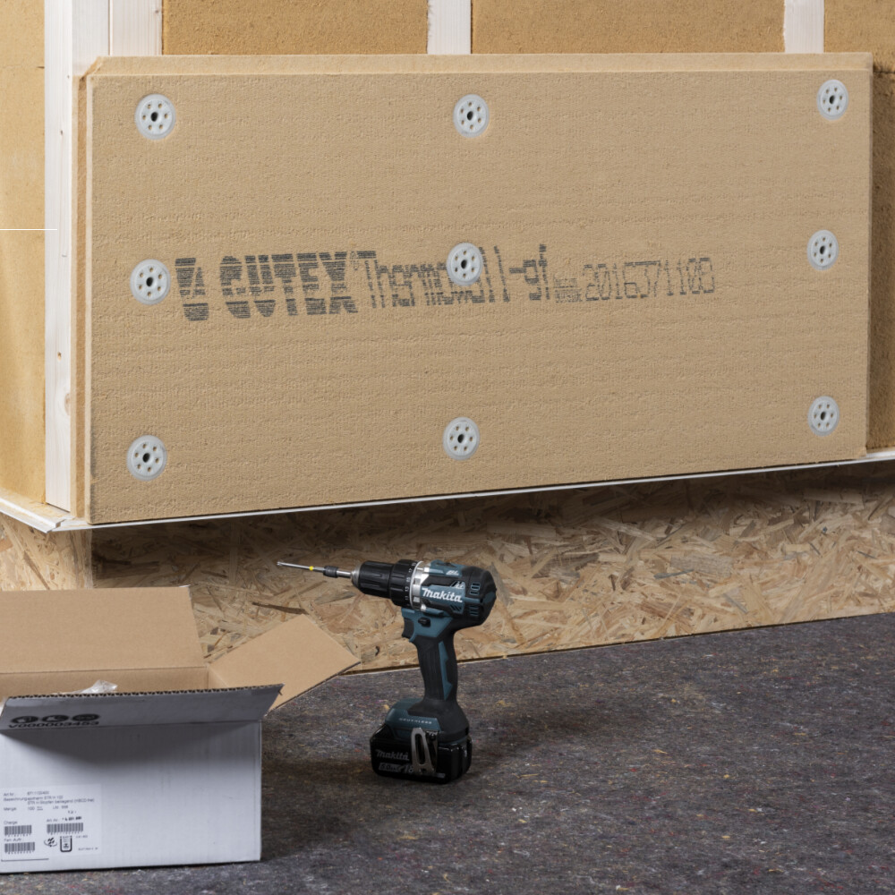 Le panneau en fibres de bois Gutex Thermowall gf est fixé dans la structure porteuse à l'aide de la cheville à visser Baumit Bois.