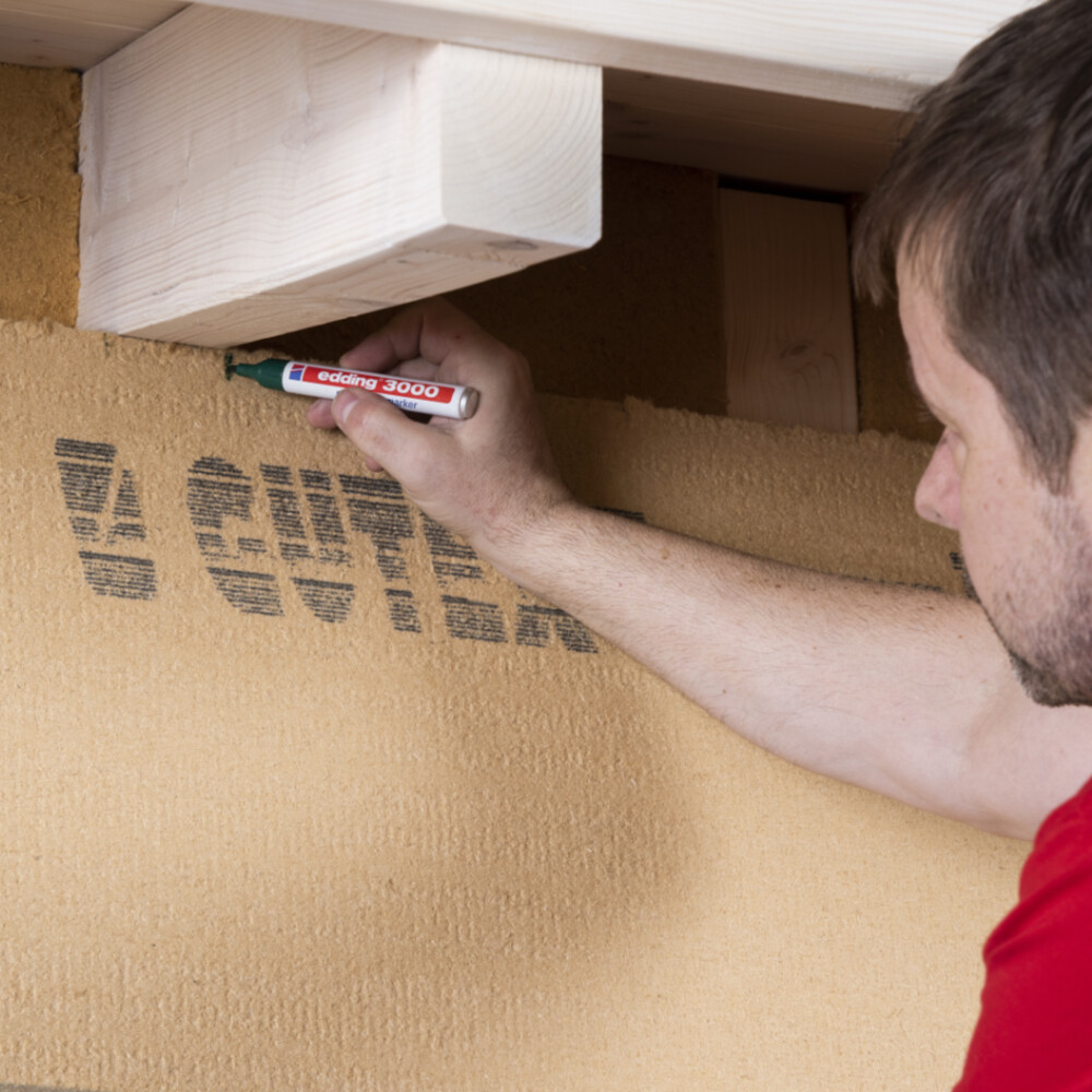 Tiens la plaque à l'endroit où elle sera installée plus tard et marque la position du chevron. Pour la mise en place ultérieure de la bande d'étanchéité de joint, ajoute 5 mm de chaque côté du chevron.