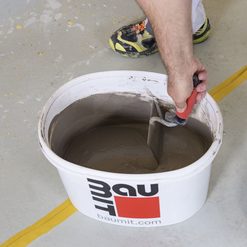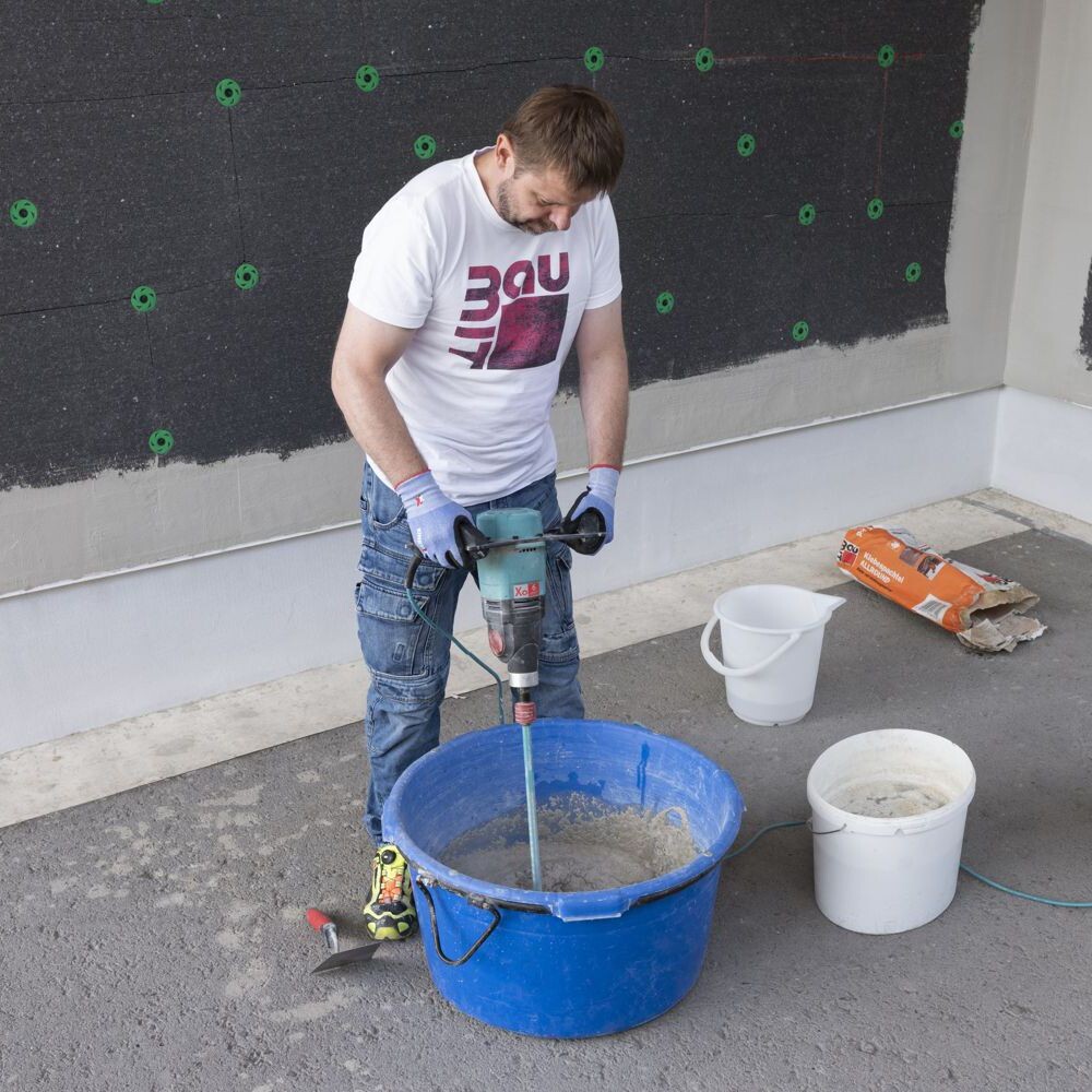 Pour les petites quantités, tu peux mélanger le Badigeon d'étanchéité avec une truelle de maçon. Pour les grandes quantités, nous recommandons d'utiliser un mélangeur électrique.