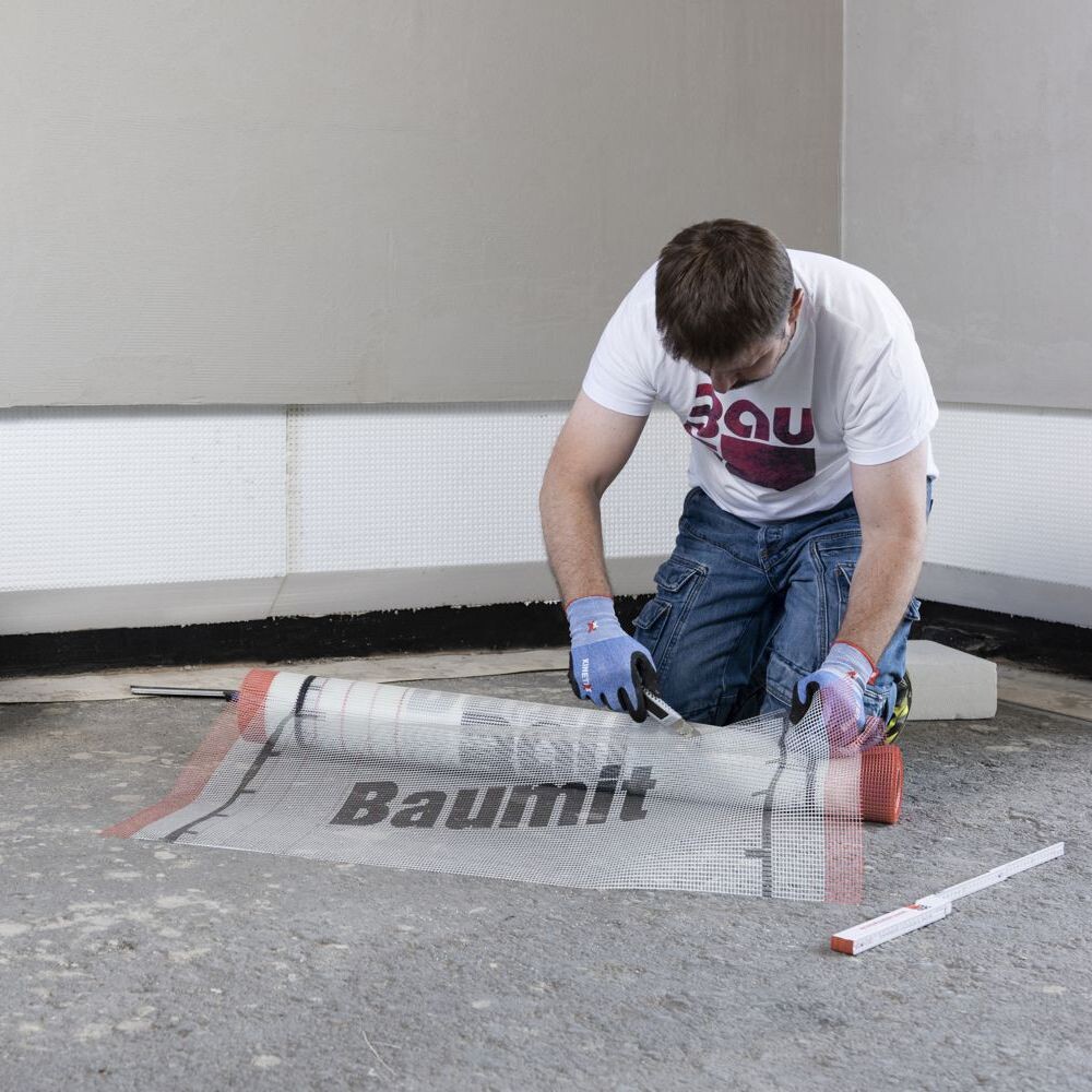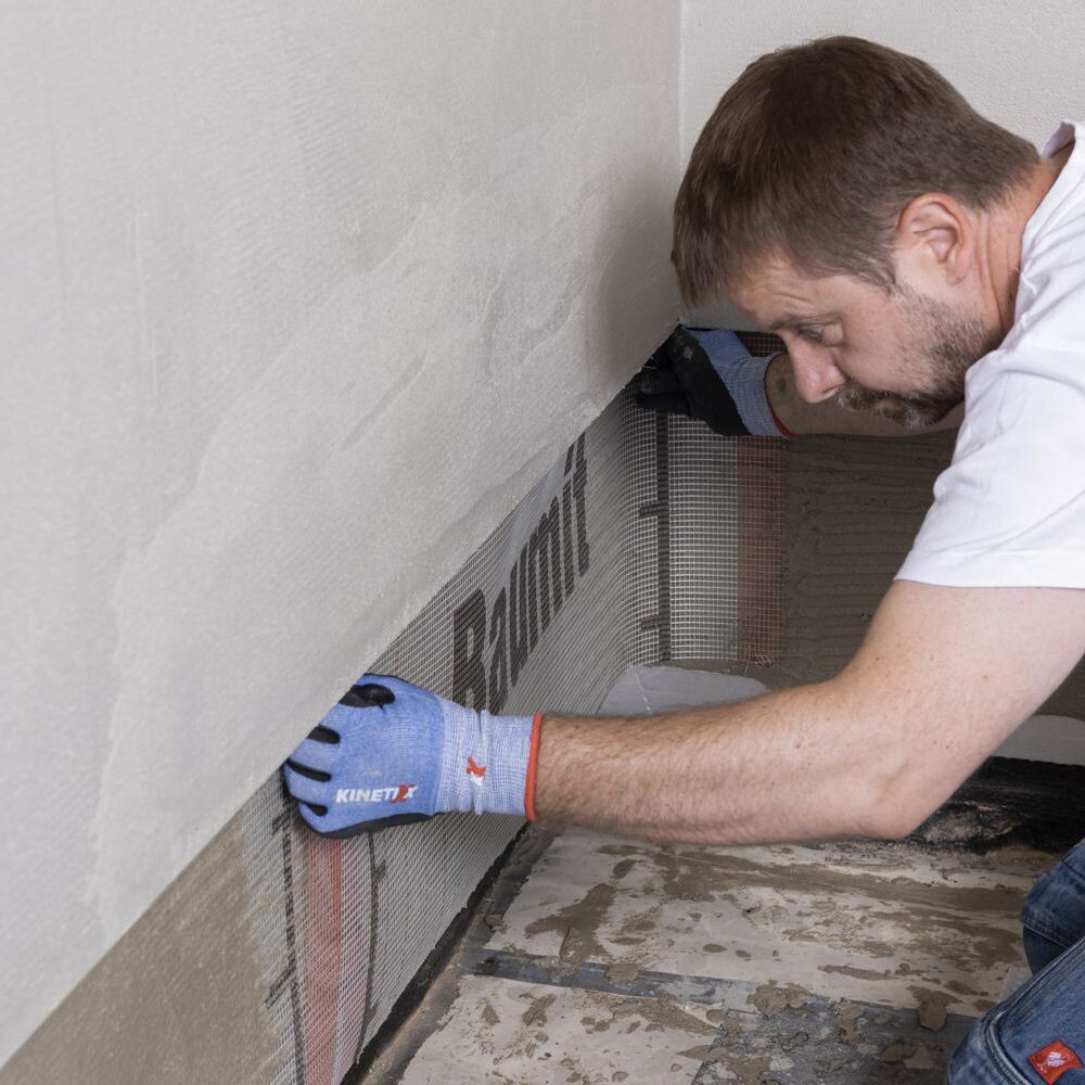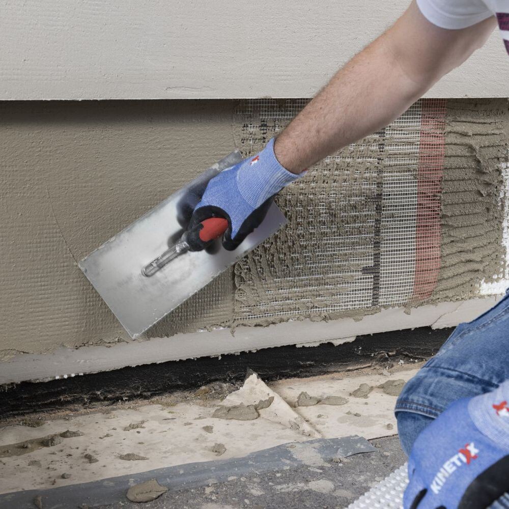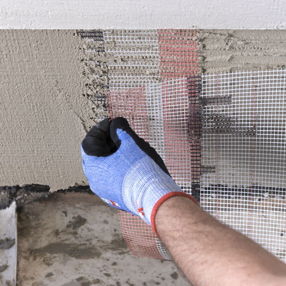 Tu noies ensuite la Toile d'armature dans le mastic-colle frais avec le côté lisse de la truelle dentée. Le tissu ne doit plus être visible une fois les travaux terminés.