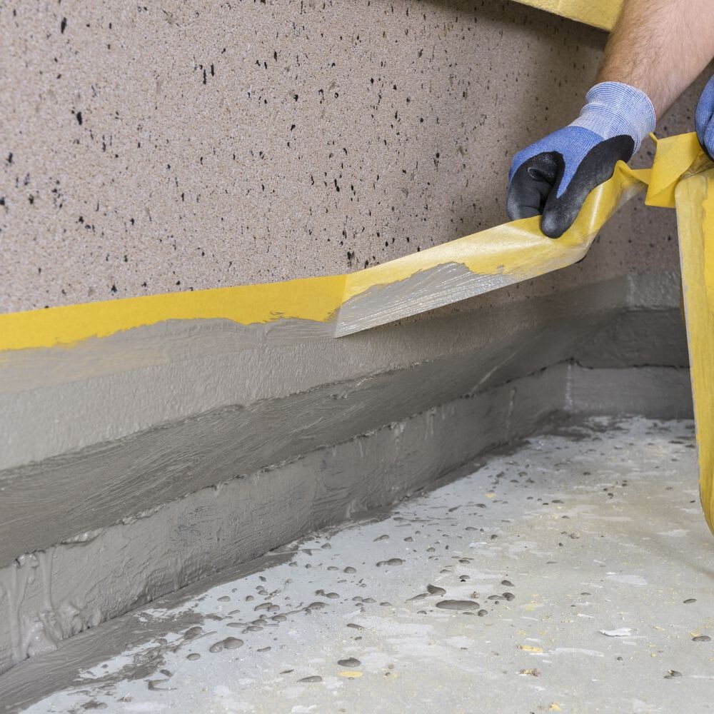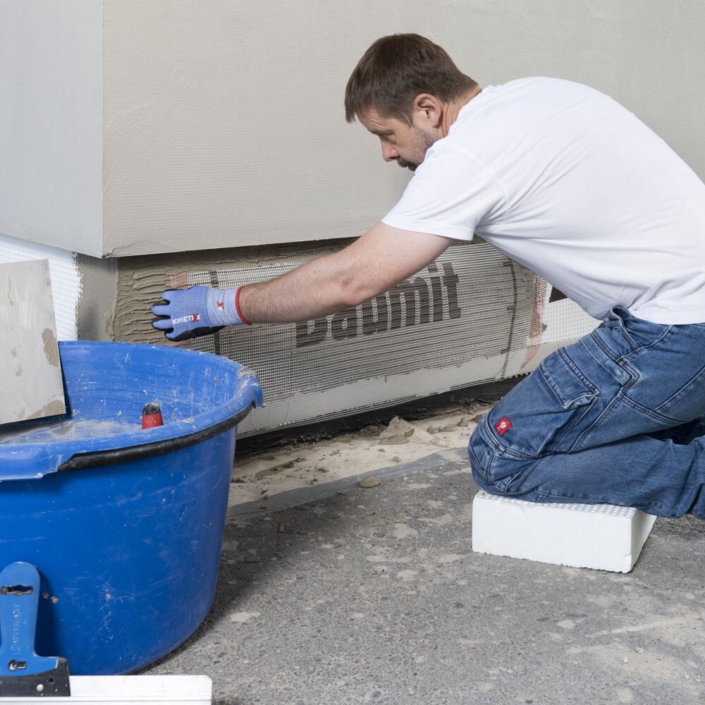 Cette étanchéité protège l'isolation du socle et l'enduit du socle par le bas dans la zone en contact avec la terre et est réalisée jusqu'à 5 cm au-dessus du futur niveau supérieur du terrain. Colle en conséquence le crépi mosaïque avec une bande d'enduit ou une bande de recouvrement dans l'alignement. Les rubans d'enduisage sont plus robustes que le crêpe de peintre et conviennent donc mieux à ces travaux.