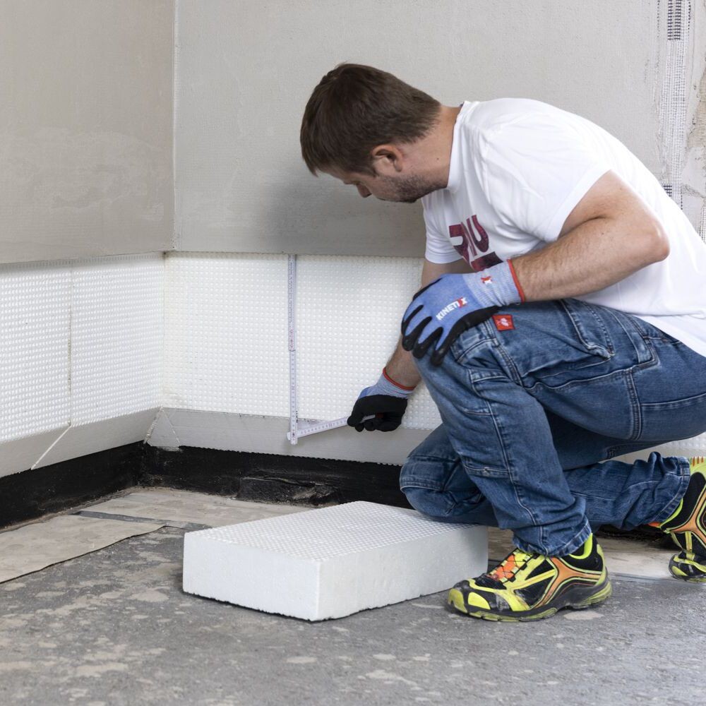 Mesure la hauteur de l'isolation de socle ou de l'isolation périphérique à enduire. Le bord biseauté de l'isolation périmétrique n'est pas enduite et n'est donc pas mesurée.