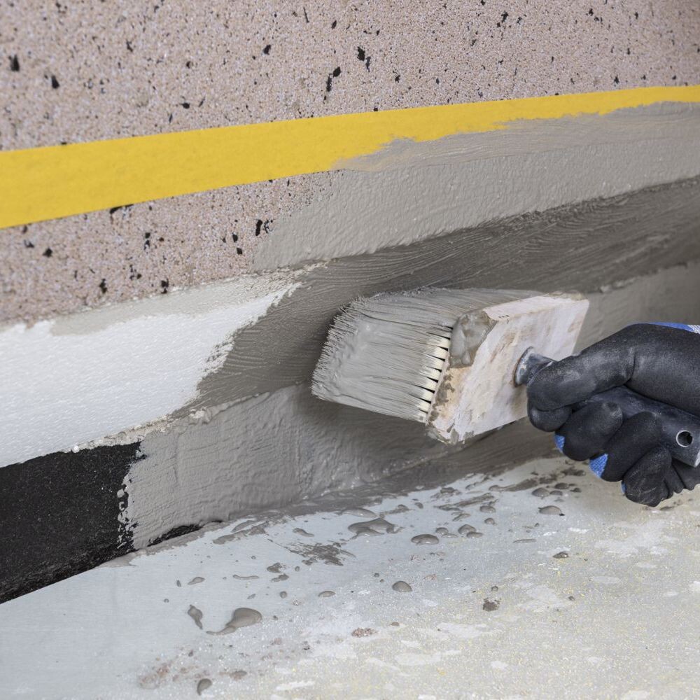 Appliquer le Badigeon d'étanchéité flexible à l'aide d'une grande houppette. Après un jour, tu appliques une deuxième couche sur le Badigeon d'étanchéité déjà appliqué. L'objectif est d'obtenir une épaisseur totale de 1 mm.