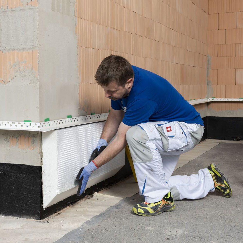 La zone de jonction entre le profilé de socle et l'isolation de socle est étanchéifiée à l'aide d'une bande Kompriband ou d'une bande d'étanchéité de joint.