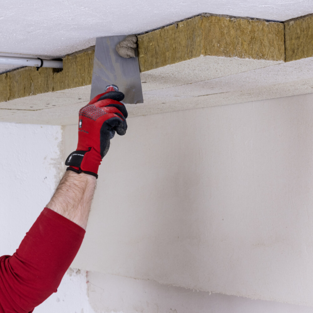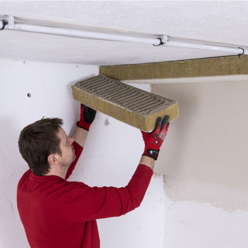 Les panneaux isolants pour plafonds de cave en laine minérale (lamelle) sont collés sur toute la surface d'un plafond. Comme le mortier adhésif ne permet pas de compenser plus de 5 mm d'inégalités, le plafond doit, si nécessaire, être égalisé au préalable avec le Mortier adhésif ALLROUND.