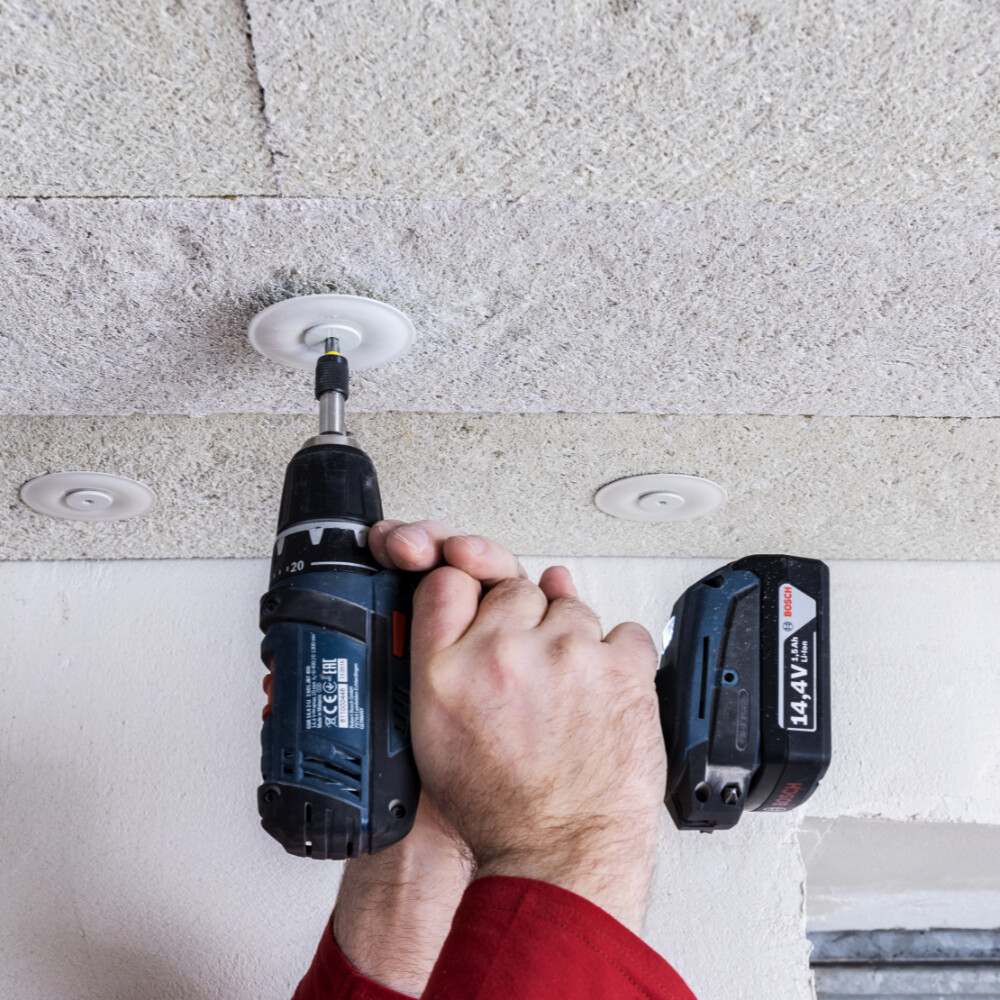 La vis pour isolation de plafond de cave DDS est vissée directement dans le plafond en béton sans autres chevilles. Le diamètre du trou est de 6 mm pour ce Produit. Pour cela, tu as besoin d'une visseuse sans fil puissante de 14 volts, voire de 18 volts.