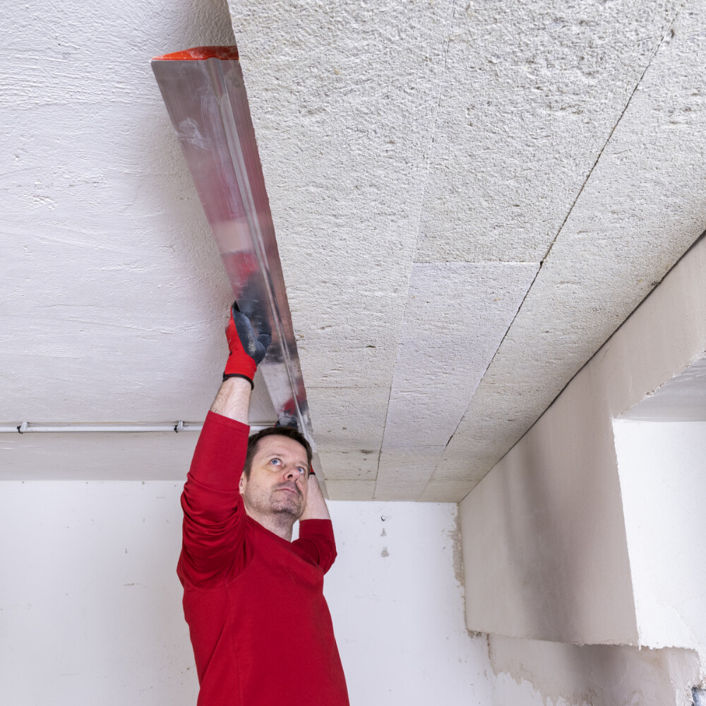 A l'aide d'une latte de réglage (150 cm à 180 cm de longueur), tu vérifies si le panneau isolant pour plafond de cave est collé dans le bon alignement.