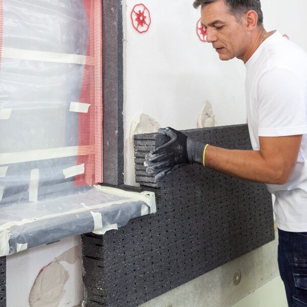 Placez immédiatement le panneau préparé contre le mur et glissez-le avec précaution sous l'appui de fenêtre. Veille à ce que les joints avec les panneaux isolants adjacents ne soient pas collés, car cela peut entraîner des ponts thermiques.
