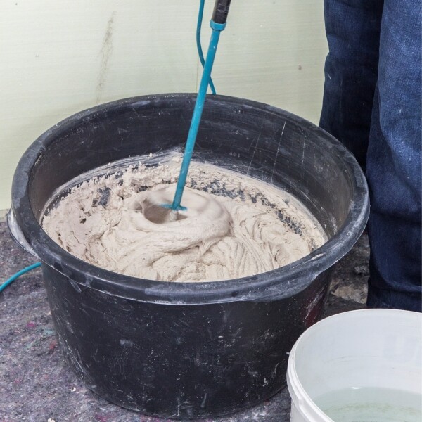 Nous te recommandons vivement d'utiliser un seau à mortier ou un seau de construction spécial. Ceux-ci sont plus robustes que les seaux domestiques traditionnels et résistent sans problème au mélange avec un mélangeur électrique.