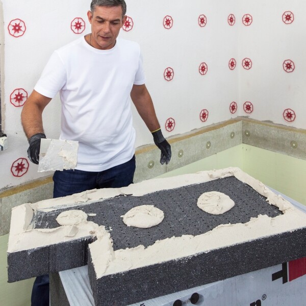 Applique maintenant de l'enduit de colle frais sur les ancres adhésives placées précédemment. L'anneau en plastique rouge doit être entièrement recouvert de colle.