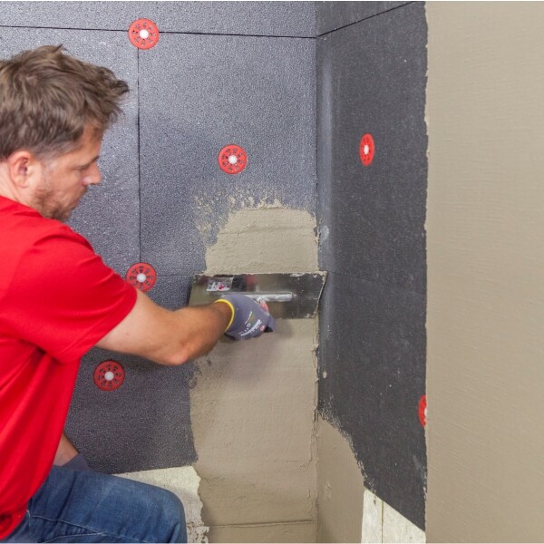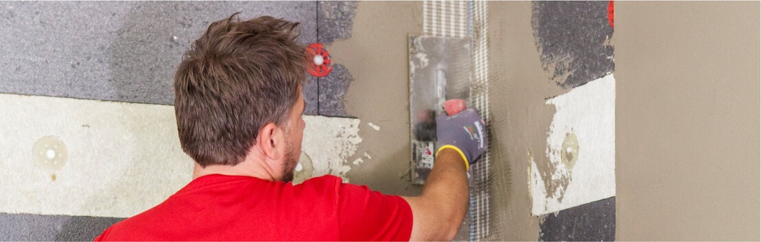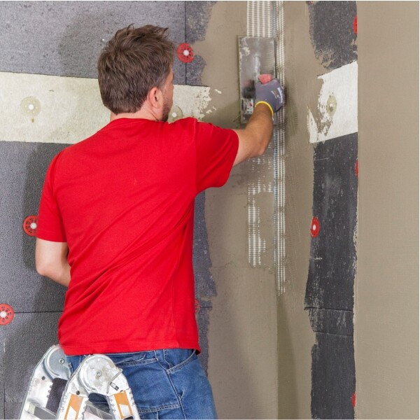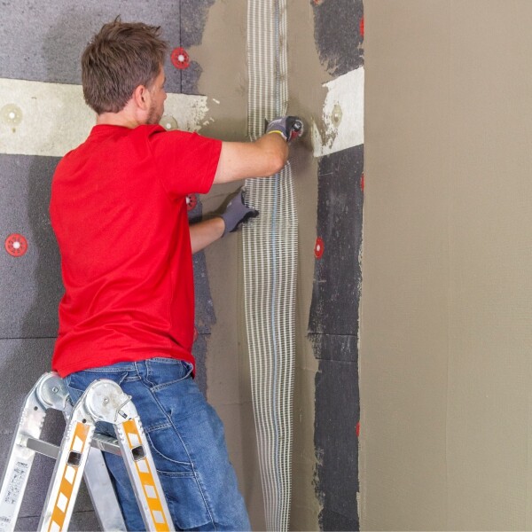 Les travaux ne doivent être effectués qu'à des températures supérieures à 5 °C (température ambiante et température de l'élément de construction) et, si possible, pas à plus de 30 °C. Le mastic-colle est un produit à base de ciment et est donc alcalin. Protégez-vous avec des vêtements de travail appropriés (gants, lunettes, etc.). Veillez à votre propre sécurité lorsque vous travaillez sur la façade. Utilisez des aides à la montée appropriées telles que des échelles ou des échafaudages de travail.