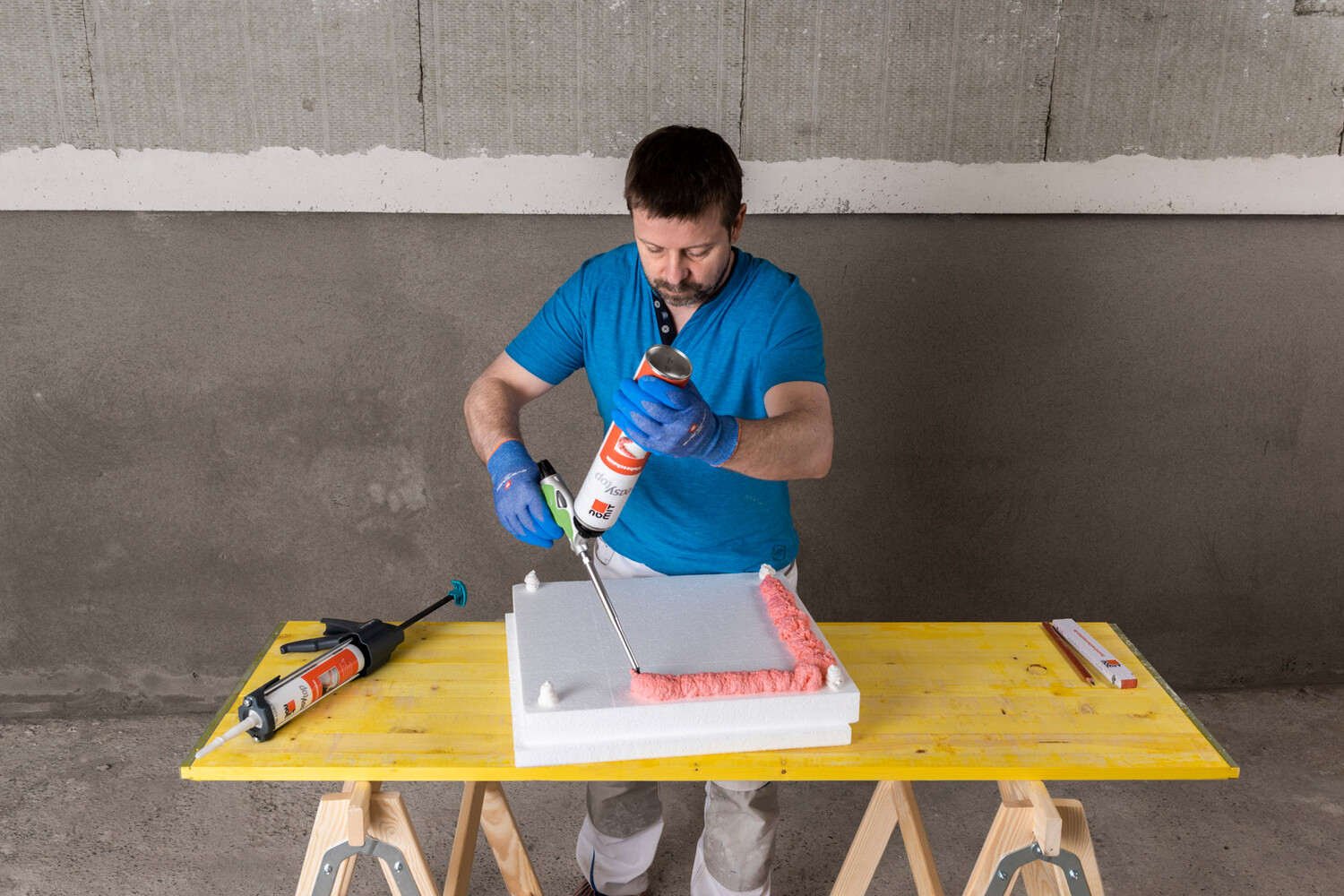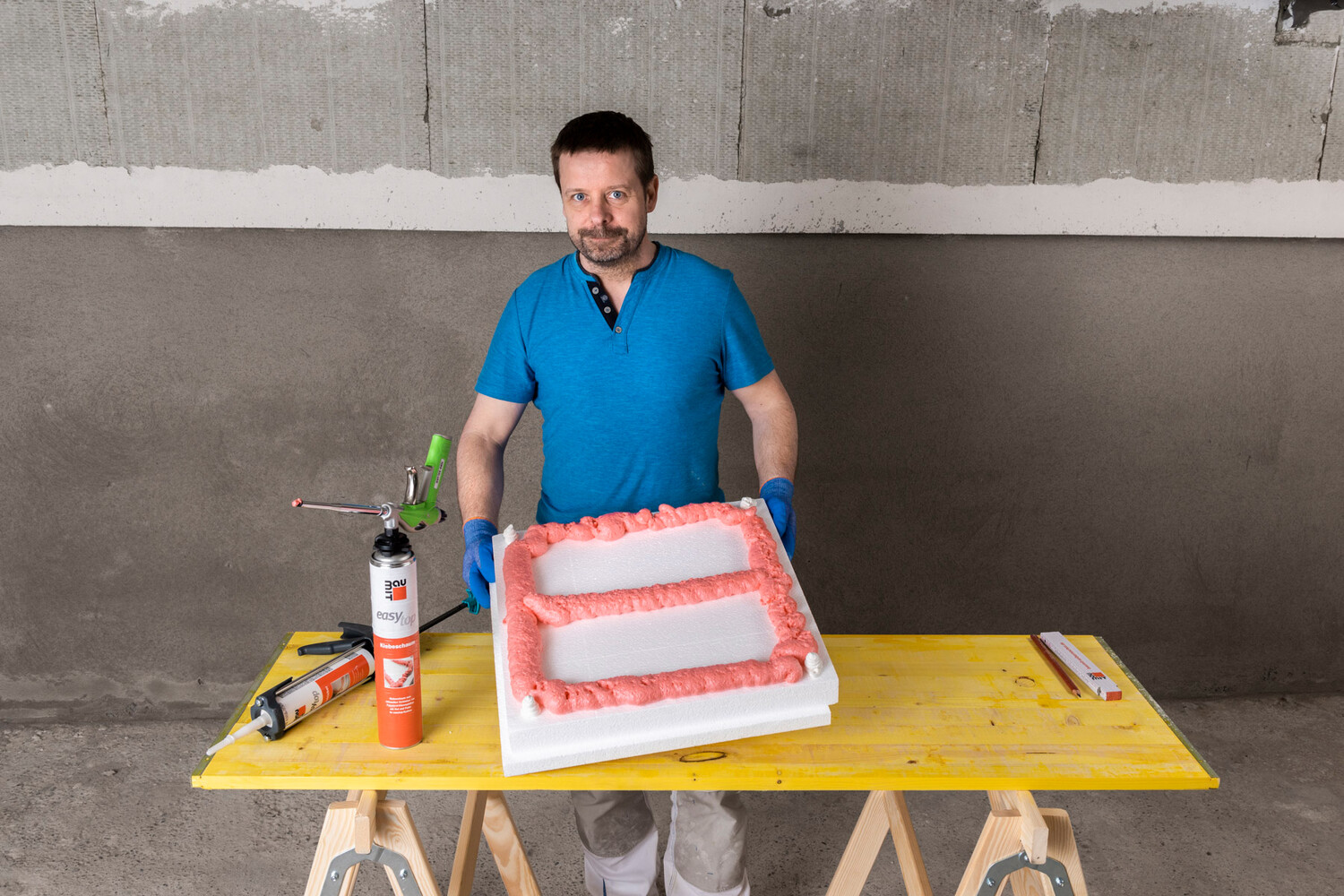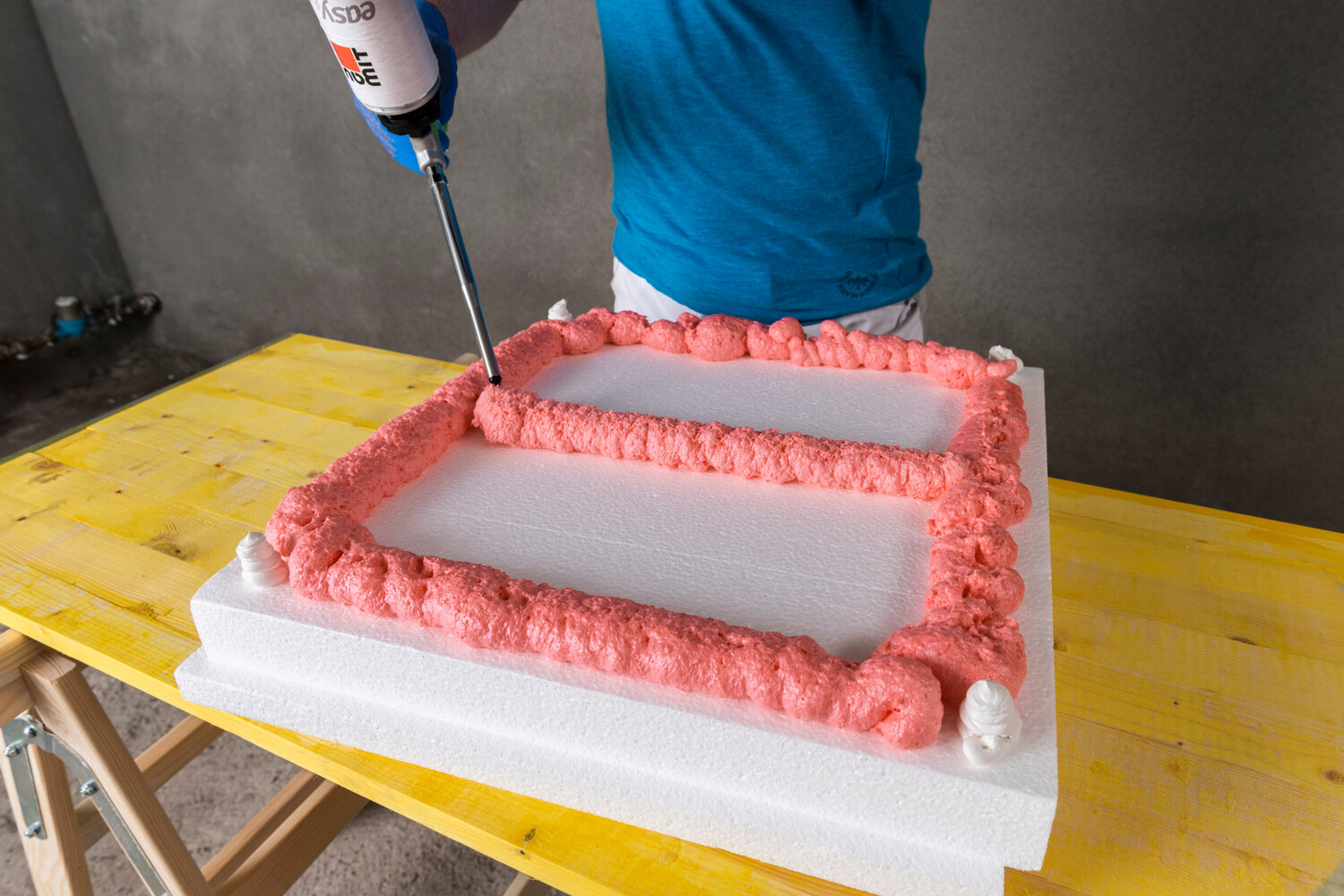 easytop Klebeschaum auf die Plattenrückseite der Polystyrol-Fassadendämmplatte umlaufend auftragen
