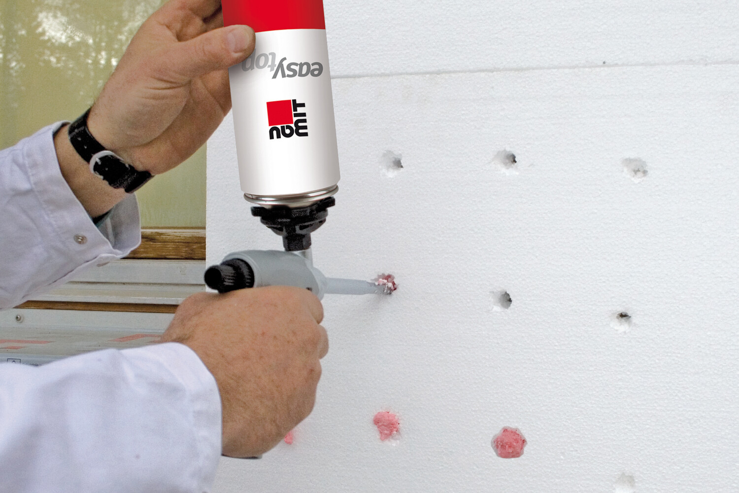 La Mousse adhésive easytop est déjà durcie après environ 3 heures. Après ce délai, on peut déjà commencer à cheviller les panneaux isolants, à poser les angles en tissu ou à appliquer l'enduit d'armature. Dans le cas d'un mortier-colle minéral, il faut compter au moins 3 à 4 jours de séchage.