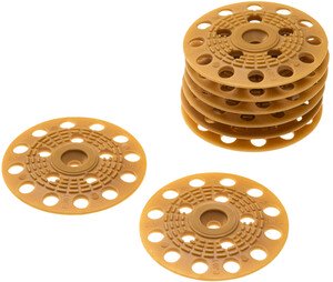 Rondelle de fixation en PVC rigide d'un diamètre de 60 mm, à combiner avec des vis à bois à tête fraisée (Ø max. 5 mm). Pour la fixation complémentaire de panneaux isolants en paroi intérieure et en façade extérieure, sans optimisation contre les ponts thermiques.
