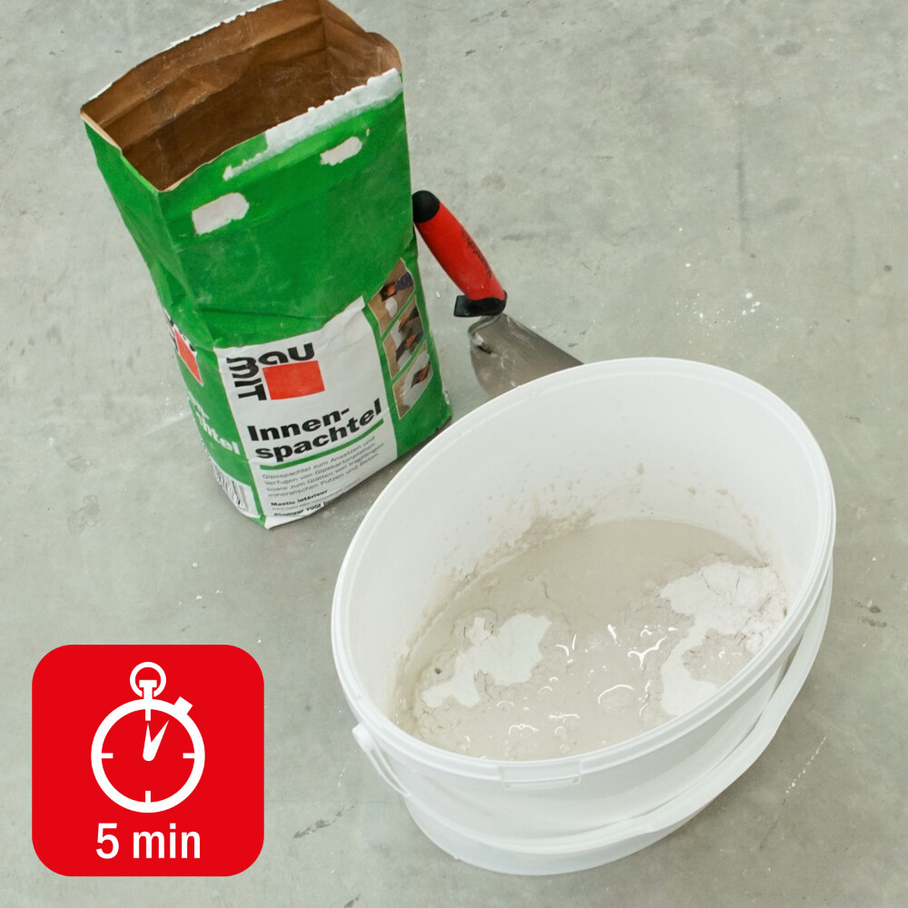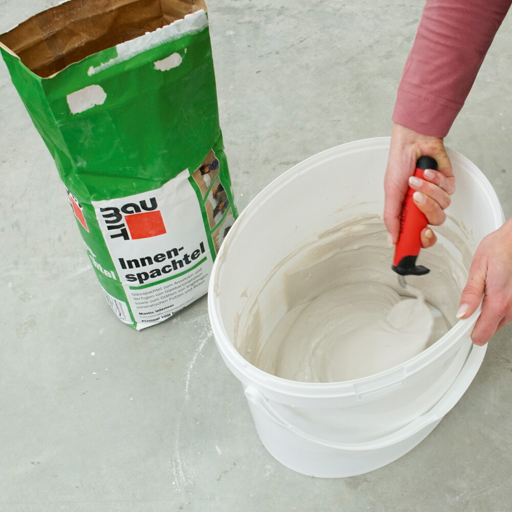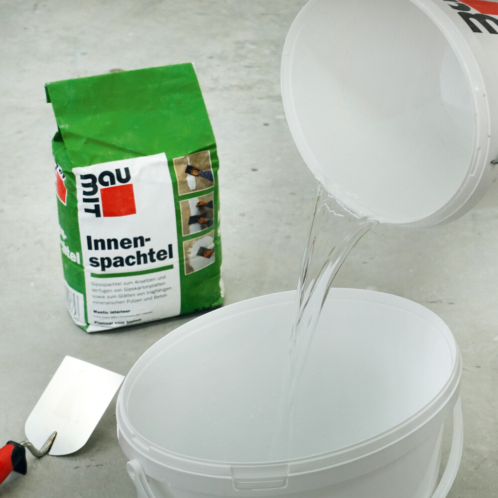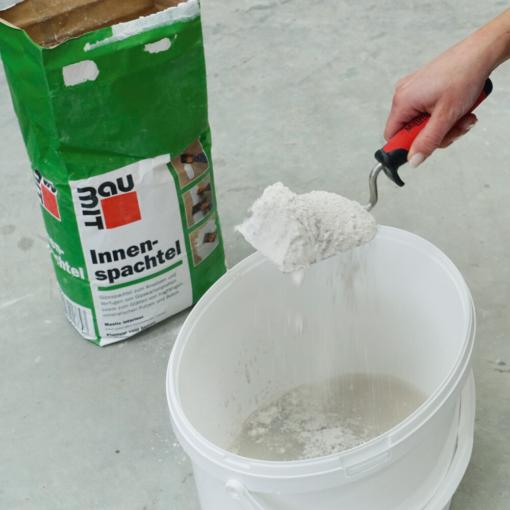 Saupoudrer ensuite l'enduit de lissage intérieur dans l'eau à l'aide de la truelle de stucateur. De cette manière, le Matériau est soigneusement entouré d'eau et peut ensuite être mélangé facilement sans grumeaux.
