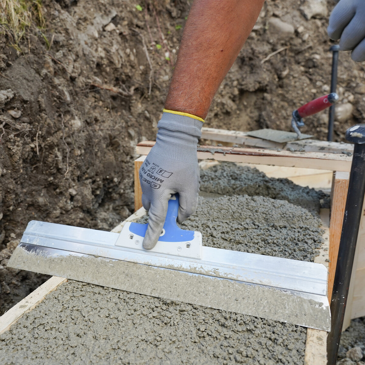 Die zuvor präzise gesetzte und waagerecht ausgerichtete Schalung erleichtert diesen Arbeitsschritt enorm, da du die Oberkanten der Schaltafeln als Abziehkante nutzen kannst.