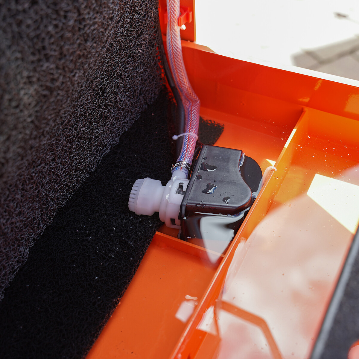 Setze die Umwälzpumpe ein, falls erforderlich. Bei manchen Modellen muss zusätzlich eine Schutzmatte eingelegt werden. Überprüfe vor dem Start alle Sicherheitsfunktionen der Säge.