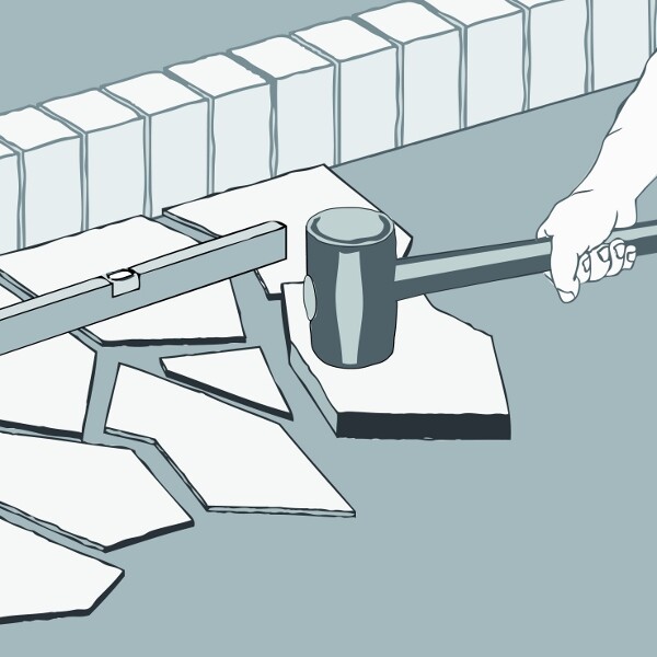 Die Platten in den frischen Natursteinverlegemörtel verlegen. Achte darauf, die Platten hohlraumfrei zu verlegen, da in diese Hohlräume Wasser eindringen und dies zu Frostschäden führen kann. Um die Platten nicht zu beschädigen, empfehlen wir hierfür einen Gummihammer.