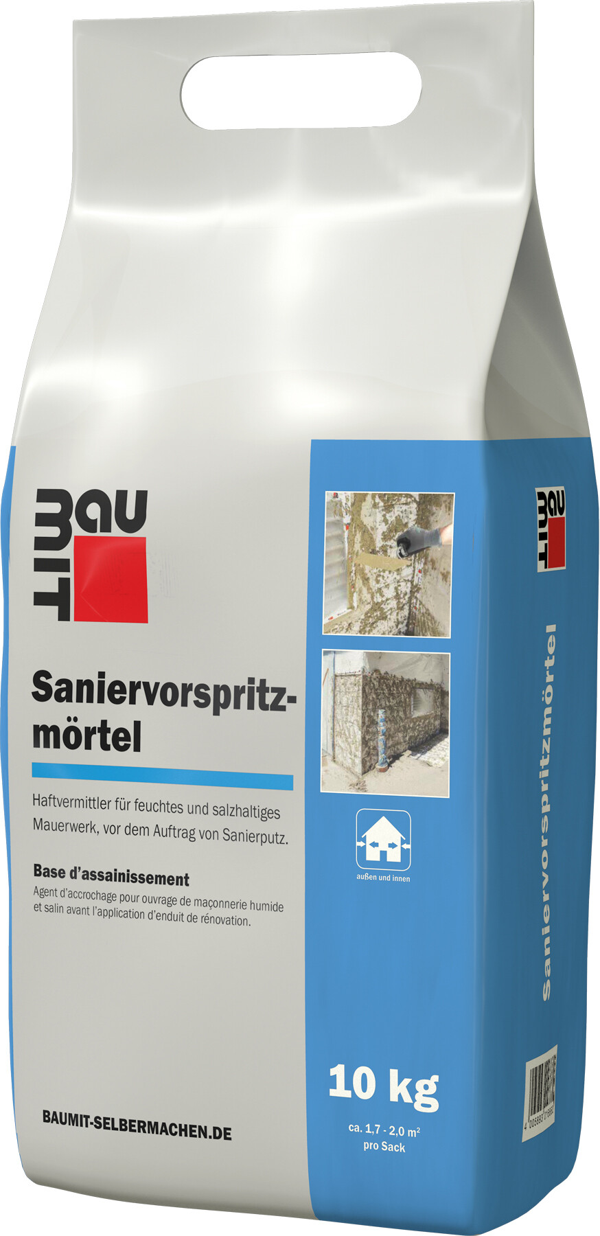 Speziell auf Baumit Sanierputze abgestimmter Spritzbewurf mit hoher Festigkeit zur Untergrundvorbereitung bzw. "Grundierung" von feuchten und/oder salzhaltigen mineralischen Untergründen als Haftbrücke zwischen Wand und Sanierputz mit hoher kapillarer Leitfähigkeit.
