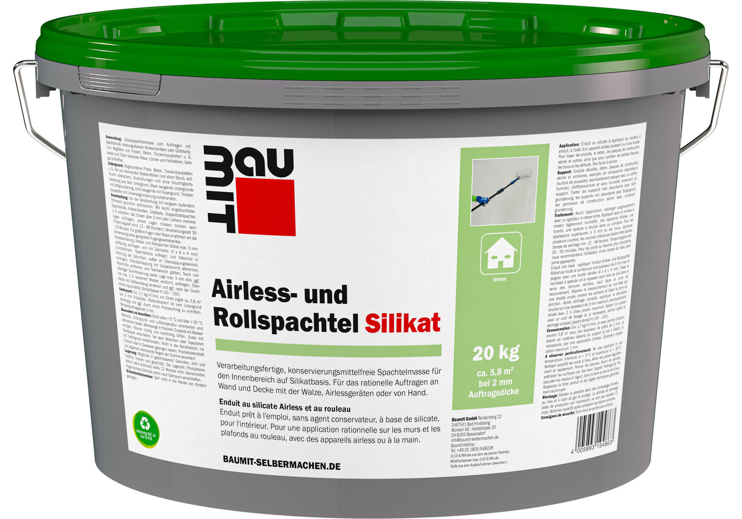 Verarbeitungsfertige, hoch diffusionsoffene, konservierungsmittelfreie Spachtelmasse für den Innenbereich auf Silikatbasis. Für das rationelle Auftragen an Wand und Decke mit der Rolle, Airlessgeräten oder von Hand.