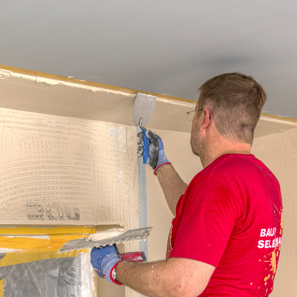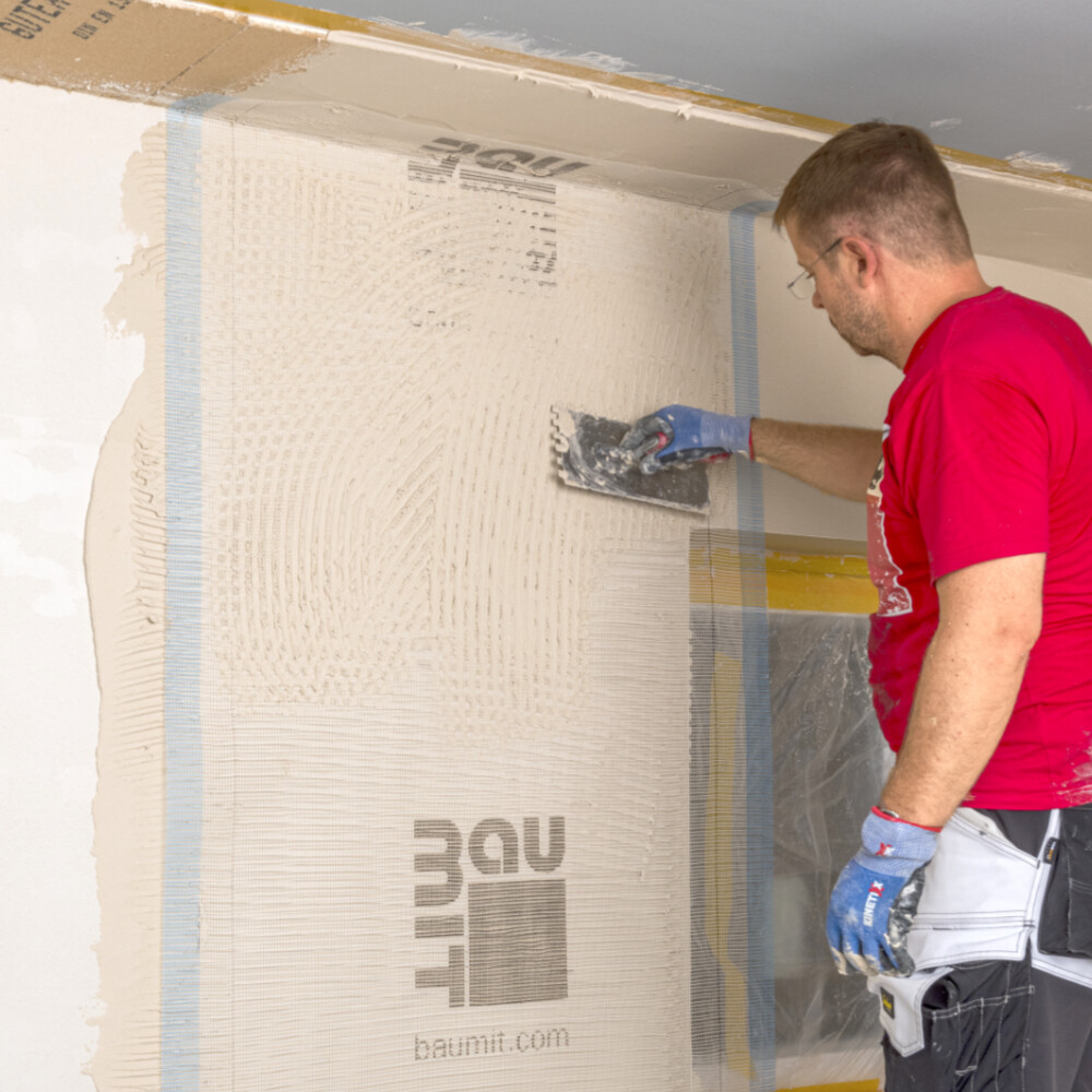 Ziehe die frische Armierungsspachtel mit einem Flächenspachtel möglichst eben ab. Das Baumit-Armierungsgewebe soll vollständig in der Spachtelmasse eingebettet und nach Abschluss der Arbeiten nicht mehr sichtbar sein.