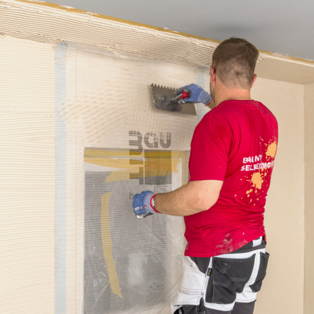 Die nachfolgend gezeigte Anleitung zum Aufbringen einer Armierungsspachtelung auf einer freigegeben Innendämmung, kannst du auch verwenden auf einer mit Kalk- oder Kalkzementputz verputzen, wassergeführten Wandheizung. Dafür muss die Putzlage komplett abgebunden und abgetrocknet sein.