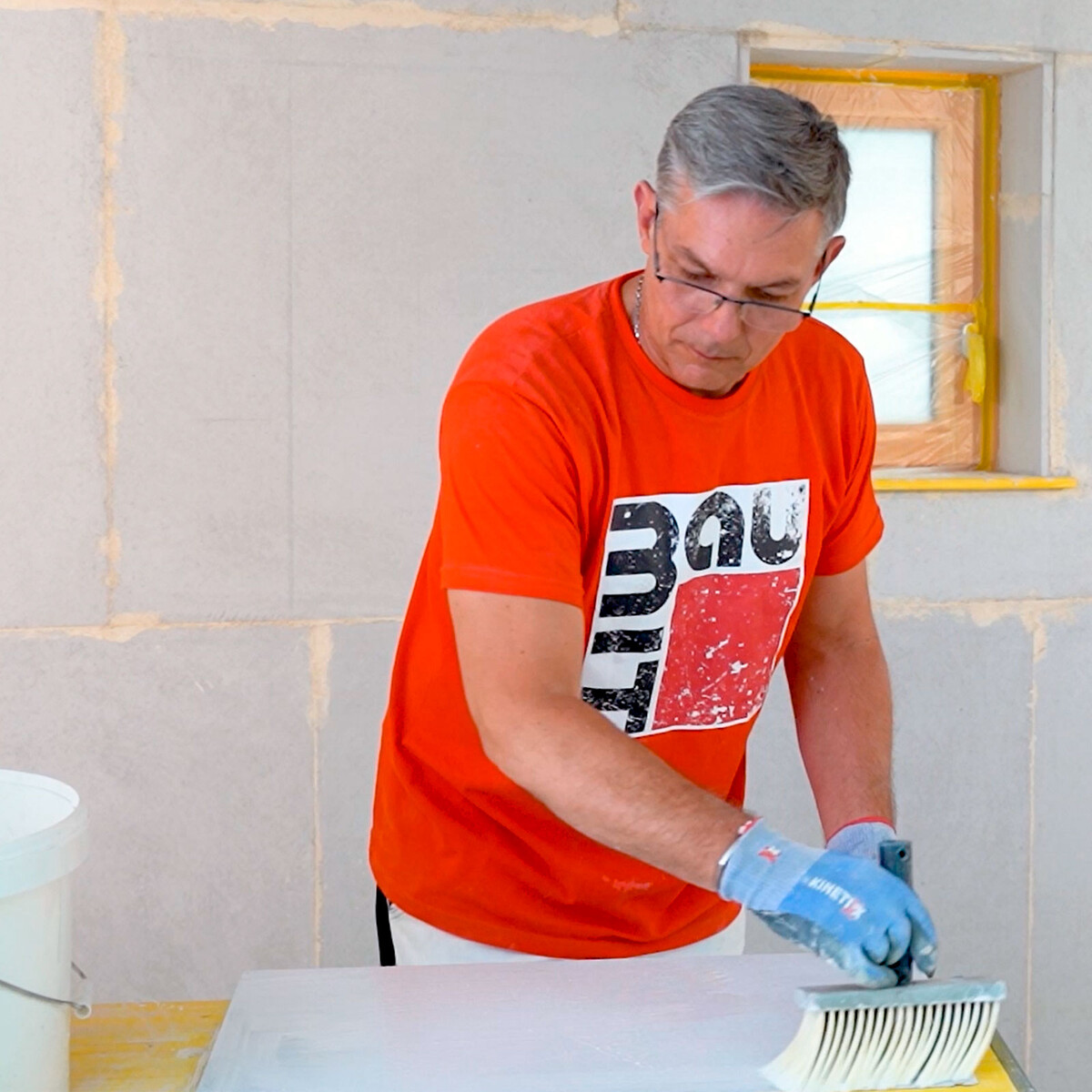 Vor dem Verkleben grundierst du die Rückseite der Laibungsplatte mit Baumit Mineralgrund (1:1 mit Wasser verdünnt). Danach kannst du sofort mit den weiteren Schritten fortfahren.