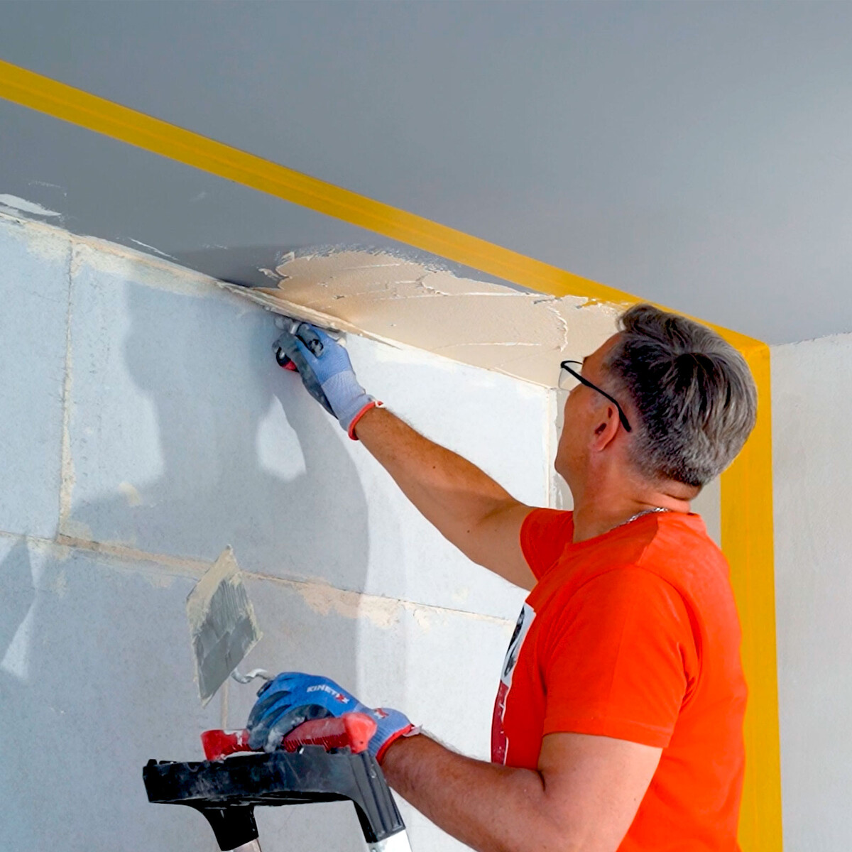 Zum Schutz der angrenzenden Decke klebst du das Klebeband in einem Abstand von 41 cm zur bereits verklebten Wandfläche.