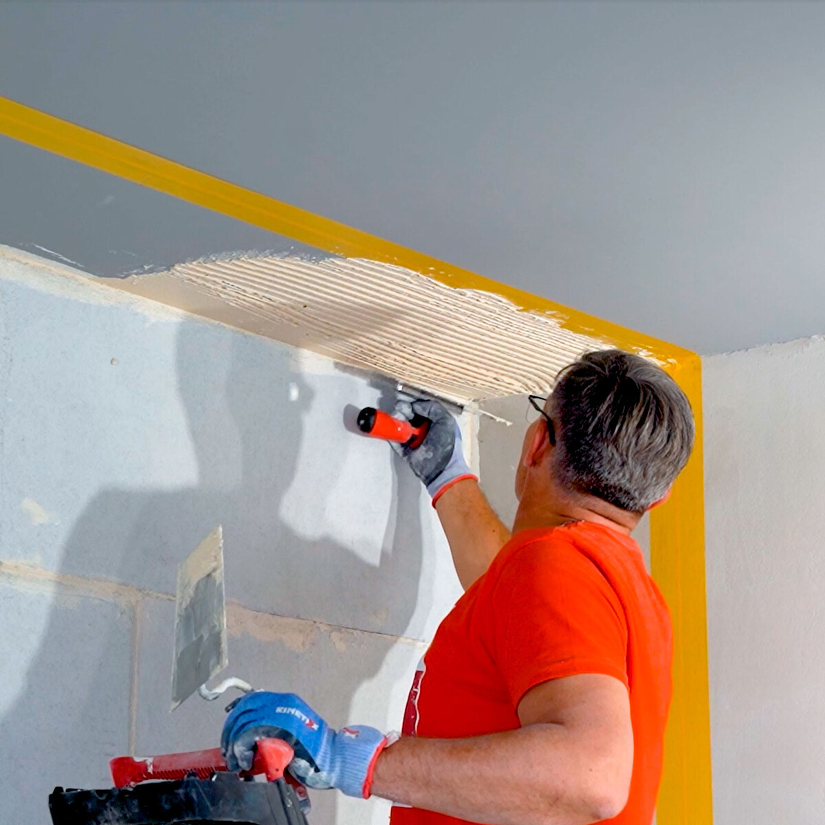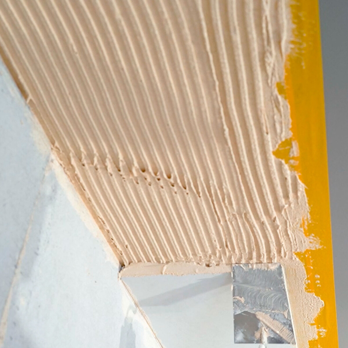 Auf die Stoßkante des Anschlusskeils zur bereits verklebten Wand trägst du den Antischimmel 2 in 1 mit einer Stuckateur- oder Maurerkelle auf.
