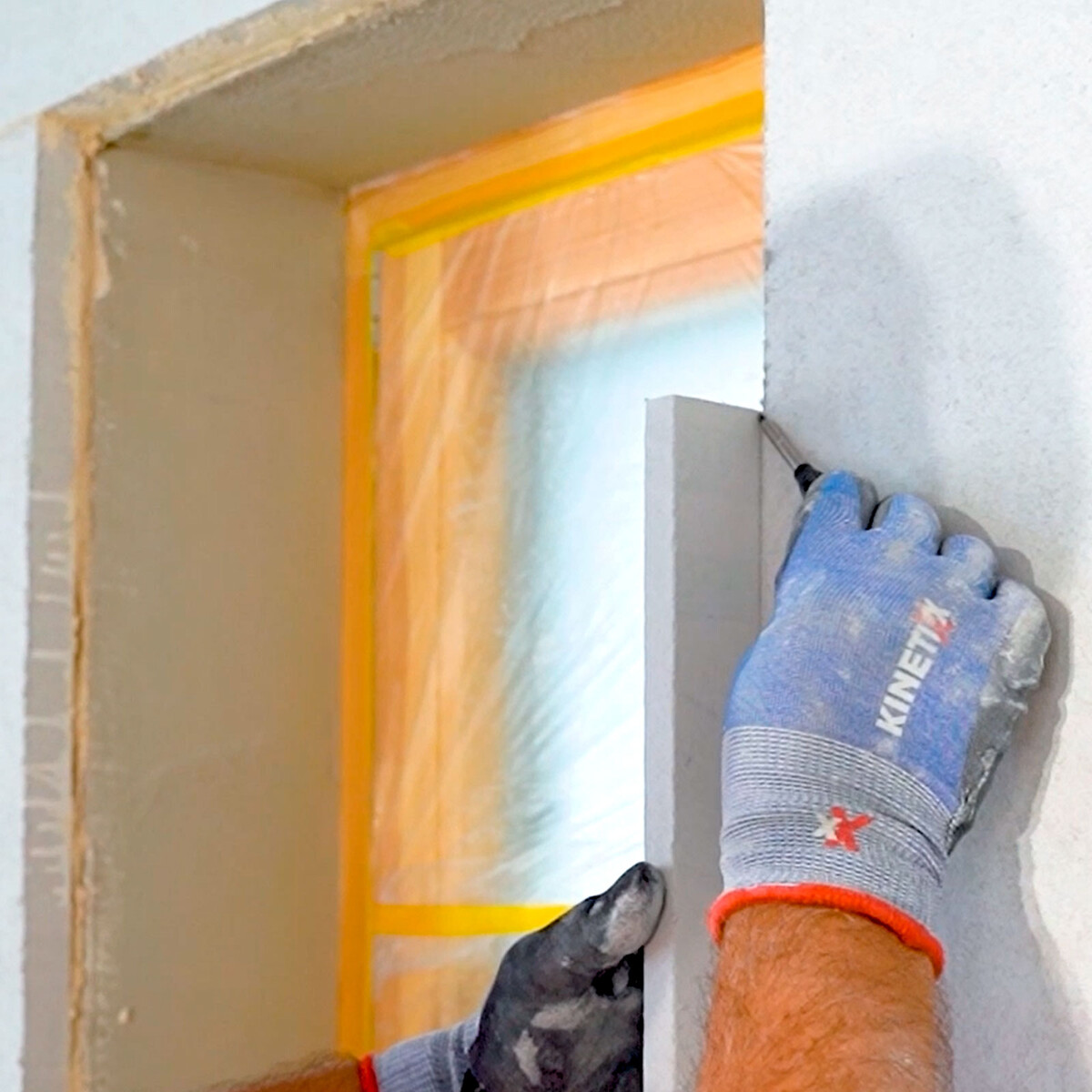Auf diese Weise klebst du die weiteren Platten seitlich und im Sturzbereich des Fensters.