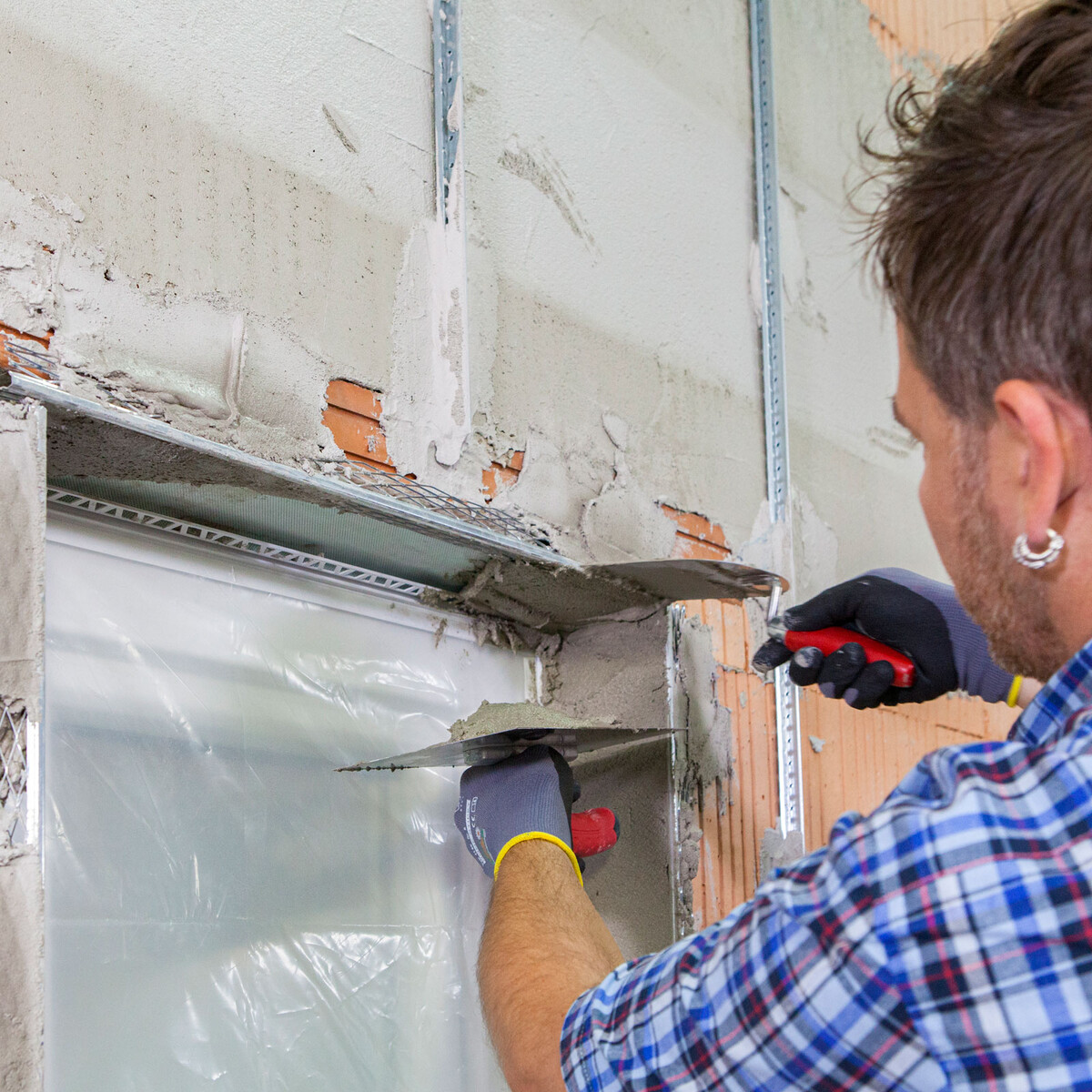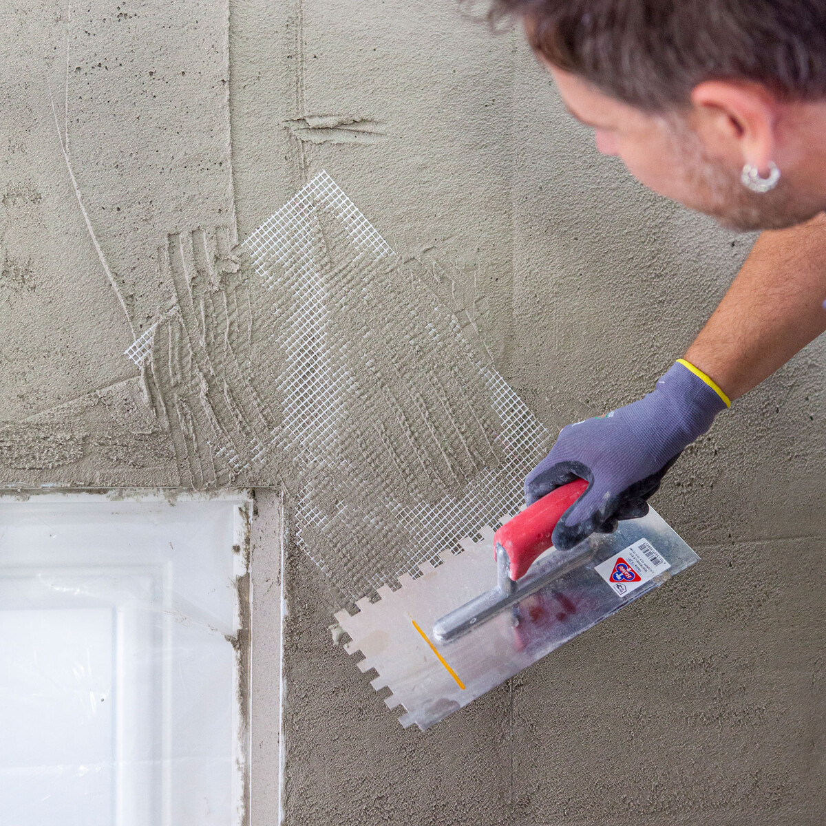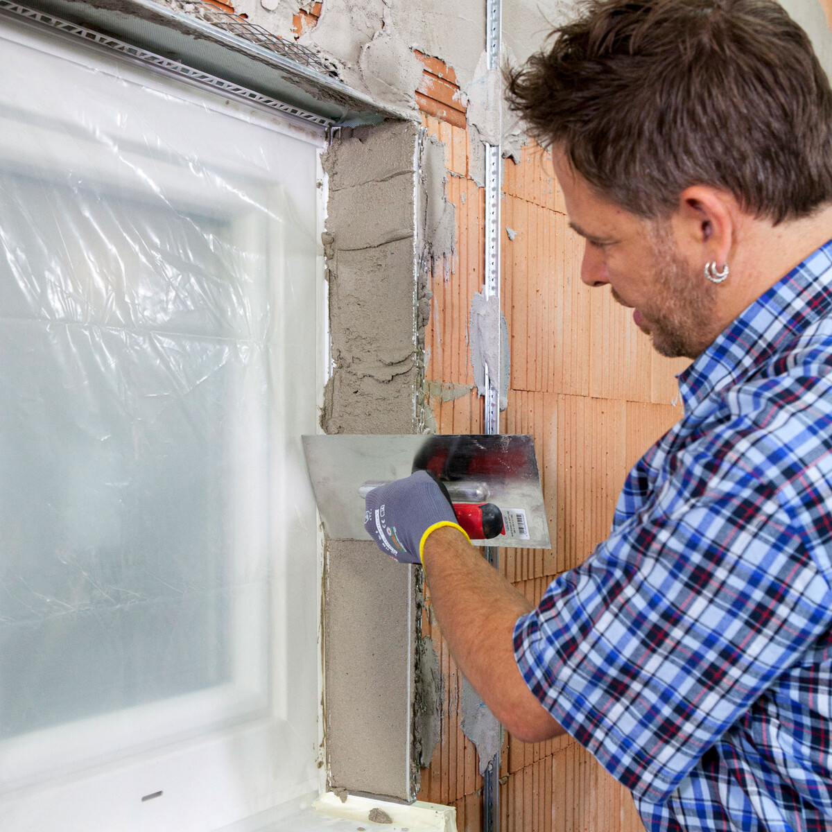 Viele Putze, Mörtel oder Spachtelmassen enthalten alkalische Rohstoffe wie Zement oder Kalk. Ein passender Arbeitshandschuh schützt deine Haut vor direktem Kontakt.